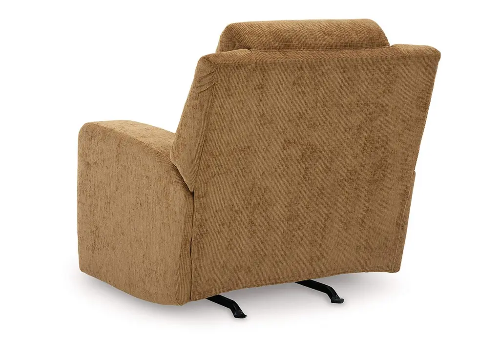 Indulgent comfort meets fashion-forward flair in the Kanlow rocker recliner. Its luxuriously soft upholstery and captivating color show off your cozy yet smart style. Sleek track arms infuse a modern sensibility, while the gentle rocking motion makes this piece even more inviting. Simple pull tab reclining puts endless relaxation within easy reach. Weight 120.000 lbs. (54kgs.)