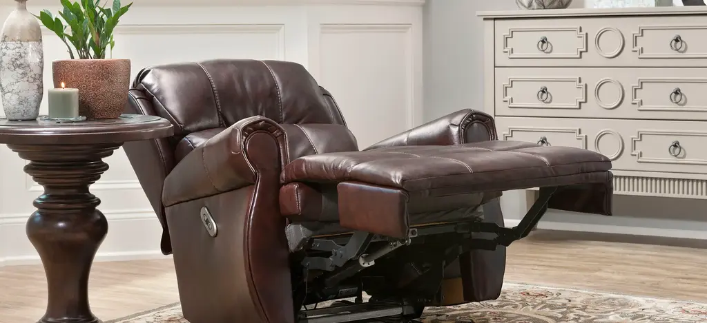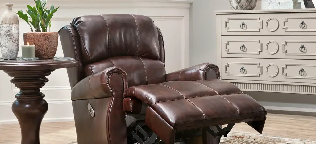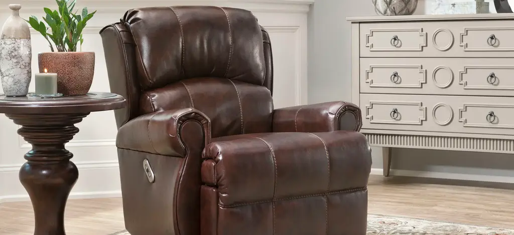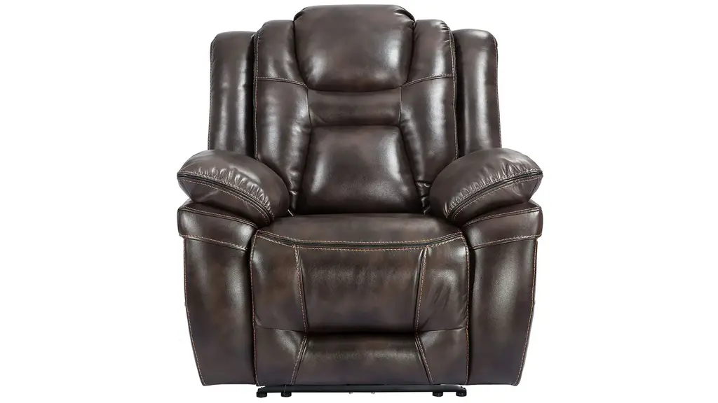 The Kaulfield recliner is a handsome choice when it comes to living room furniture. The leather-look upholstery in a deep brown hue is as classic as it gets. We also love the topstitching and rolled arms which gives this recliner an authoritative, sturdy look.