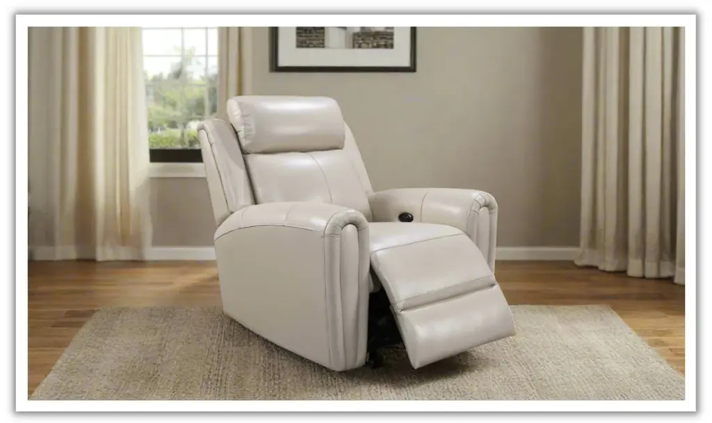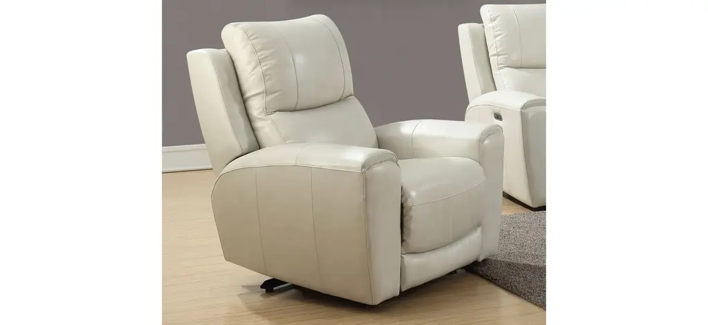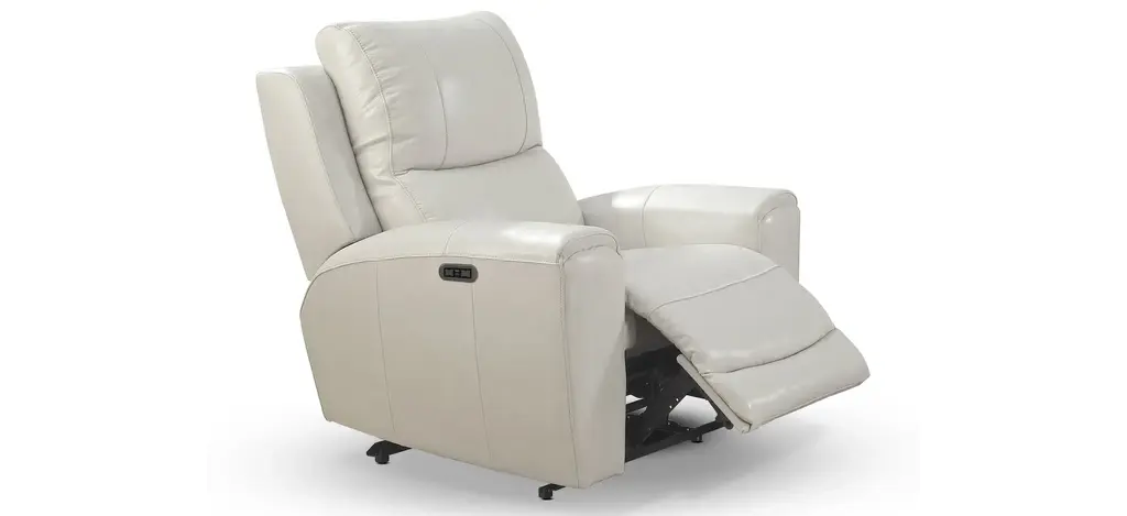 Laurel reclining collection constructed in leather with power leg rest and power articulating headrest. The Laurel Power Reclining Chair features both styling and convenience with USB charging port on the control panel along with a home button to return the piece to its original position. Available in Grey or Ivory
