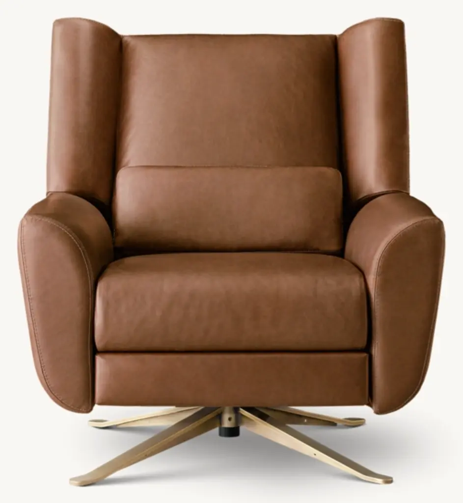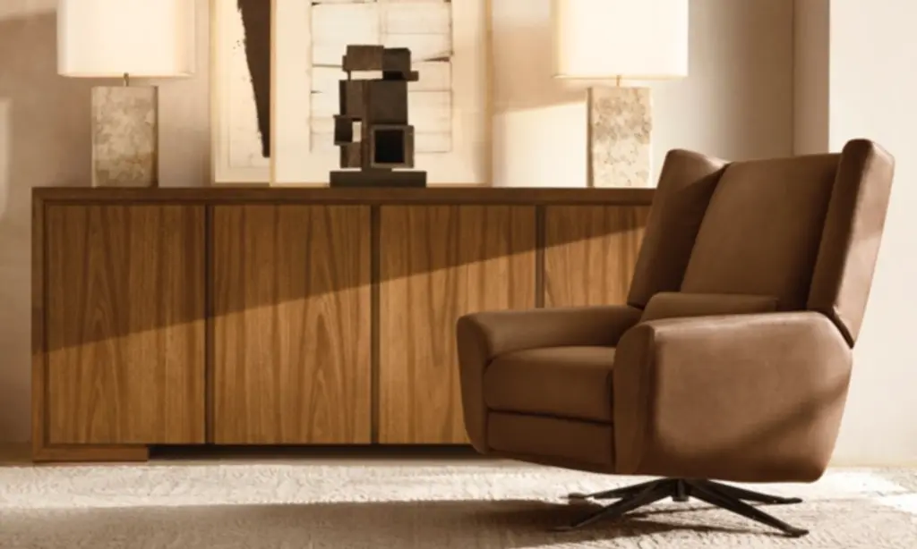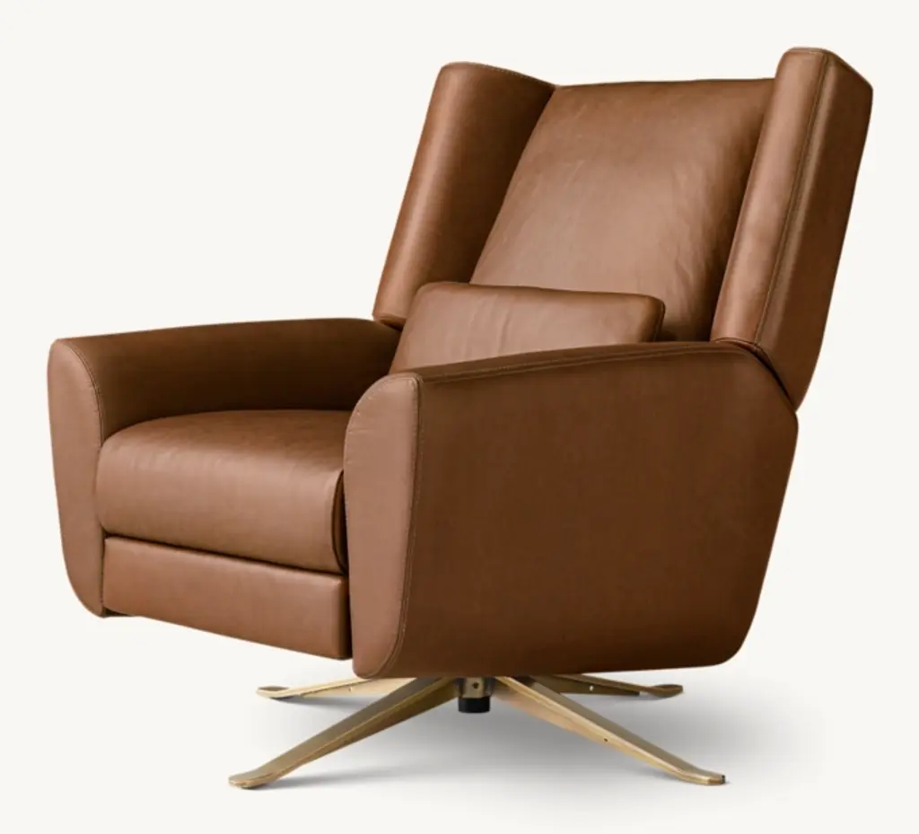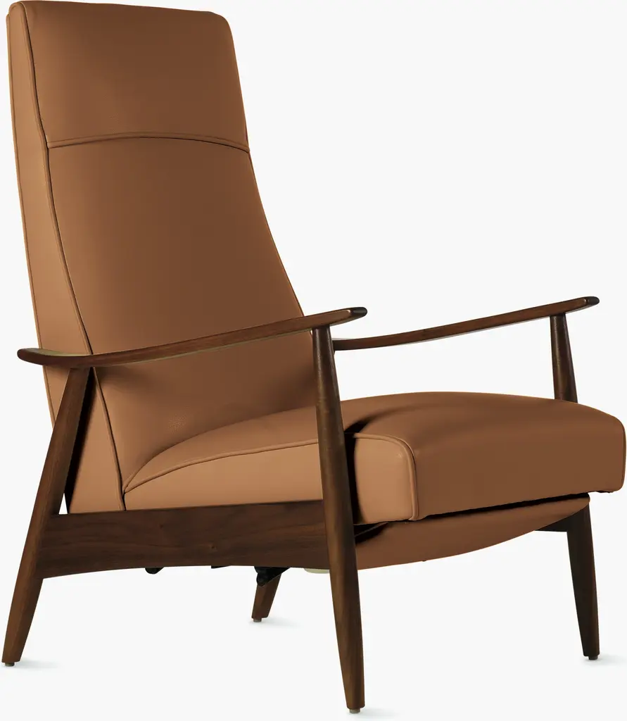 Hand assembled by master craftsmen in North America. Inspired by the modern forms and generous proportions of 1970s Italian designs, our recliner offers élan and exceptional comfort in equal measure. Set atop a smoothly swiveling base, the chair features a seamlessly integrated reclining mechanism that opens with a gentle push, and a contoured, supportive back with lumbar pillow. Guaranteed for life. ALSO AVAILABLE IN FABRIC