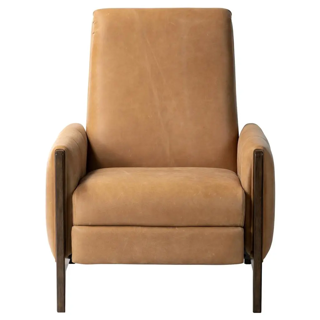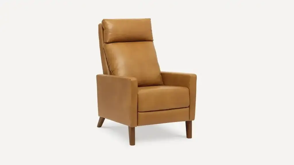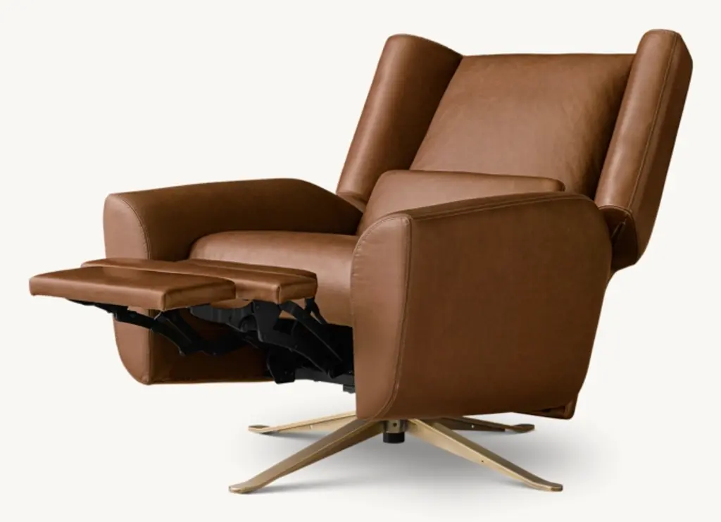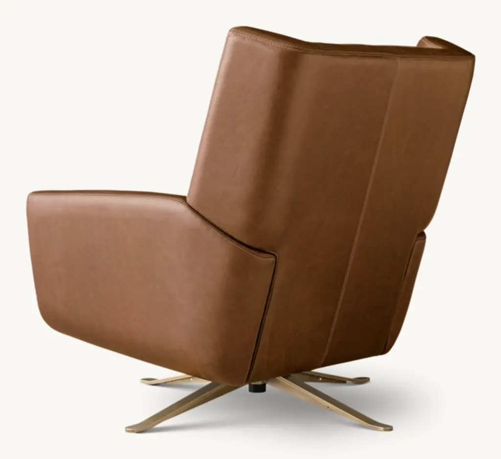Hand assembled by master craftsmen in North America. Inspired by the modern forms and generous proportions of 1970s Italian designs, our recliner offers élan and exceptional comfort in equal measure. Set atop a smoothly swiveling base, the chair features a seamlessly integrated reclining mechanism that opens with a gentle push, and a contoured, supportive back with lumbar pillow. Guaranteed for life. ALSO AVAILABLE IN FABRIC