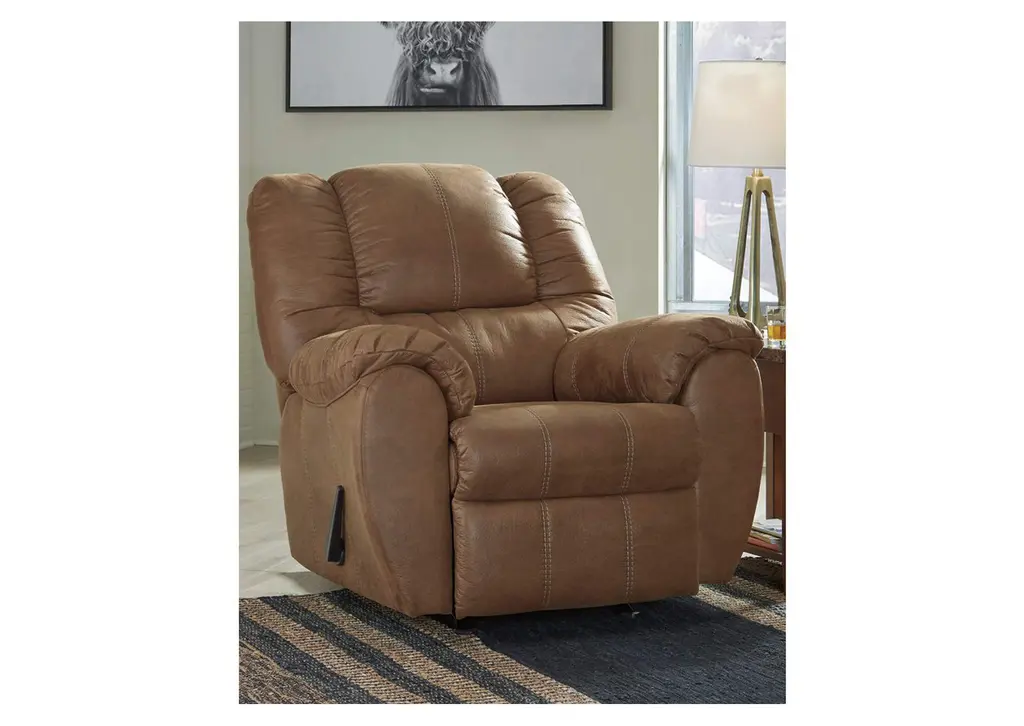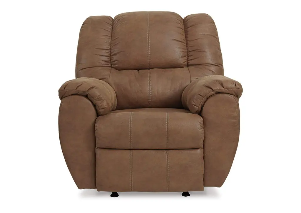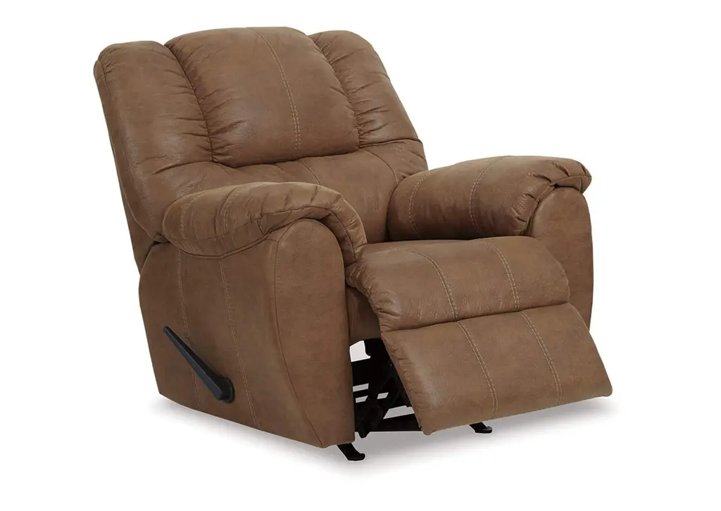 Rock the cool look of leather and the warm feel of fabric with the McGann rocker recliner. Sporting sumptuously thick cushioning, fashion-forward jumbo stitching and a richly tailored aesthetic, this smartly priced recliner with gentle rocking motion is a bestseller for good reason. Weight 110.000 lbs. (49.5kgs.)
