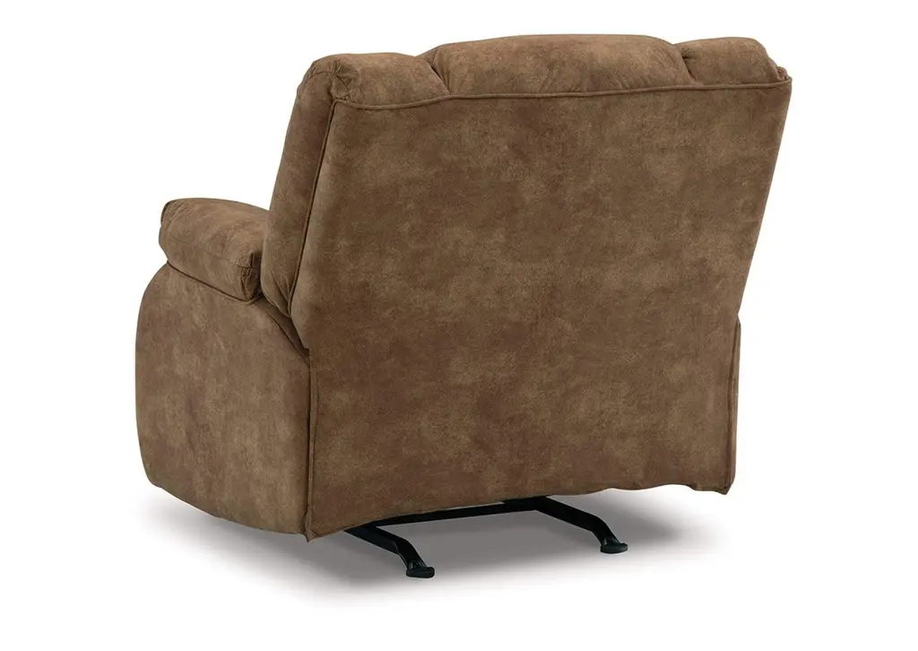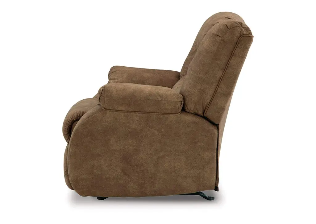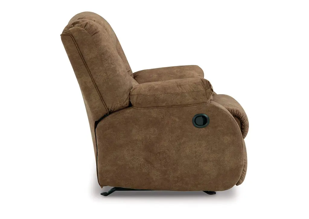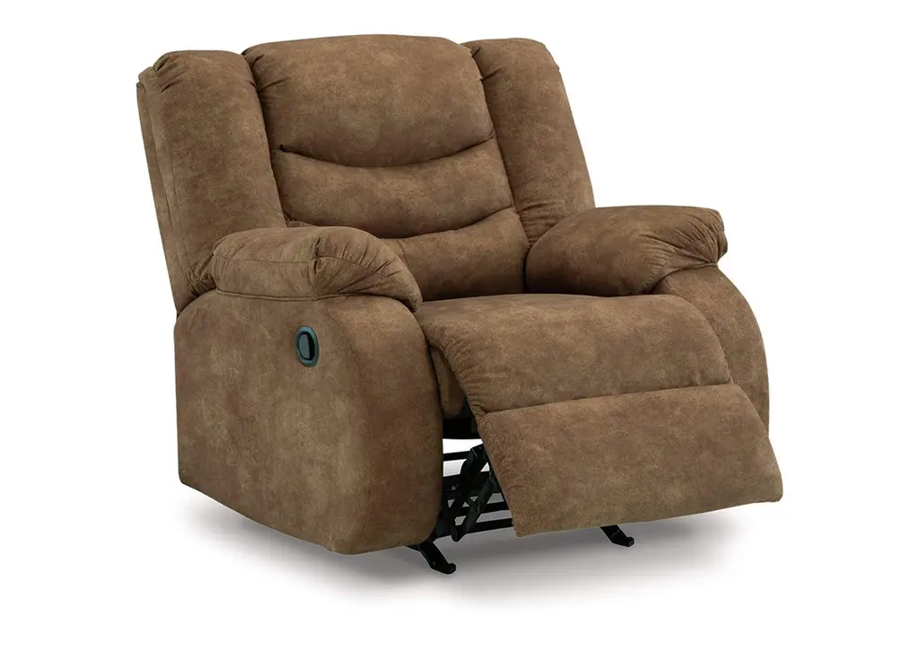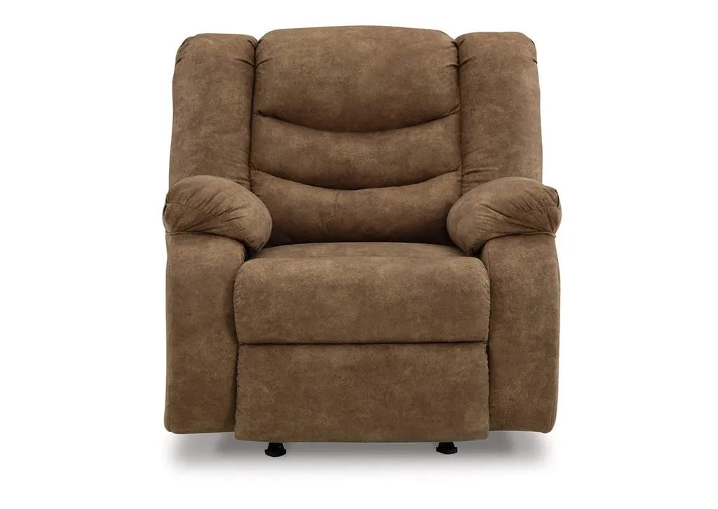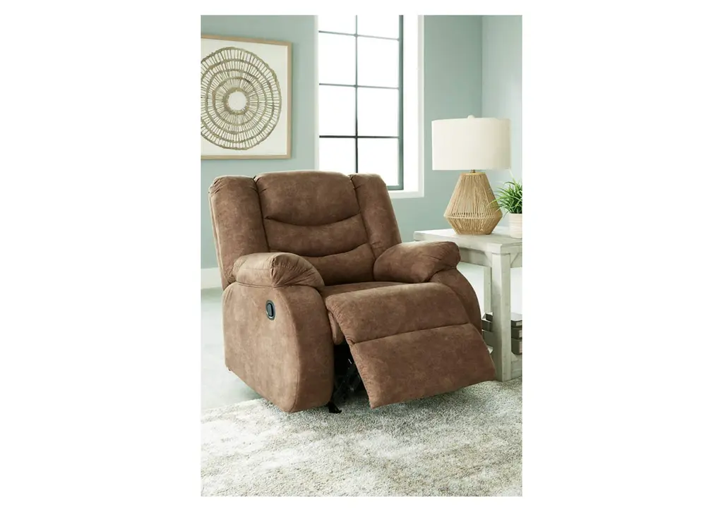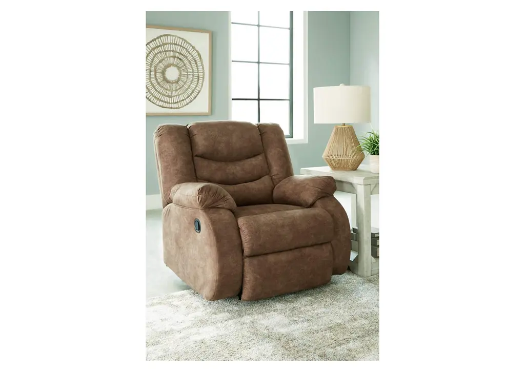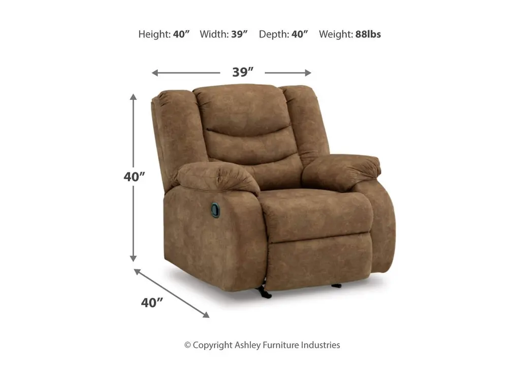 Affordable luxury made easy. The Partymate recliner is an essential for living room lounging. Its warm brown faux leather is well-suited for mixing and matching with your existing pieces. Pull tab reclining keeps you covered when it comes to comfort. And this functional piece is equally as fashionable, with design details like a channel-stitched back incorporating subtle visual interest. Weight 88.000 lbs. (39.6kgs.)