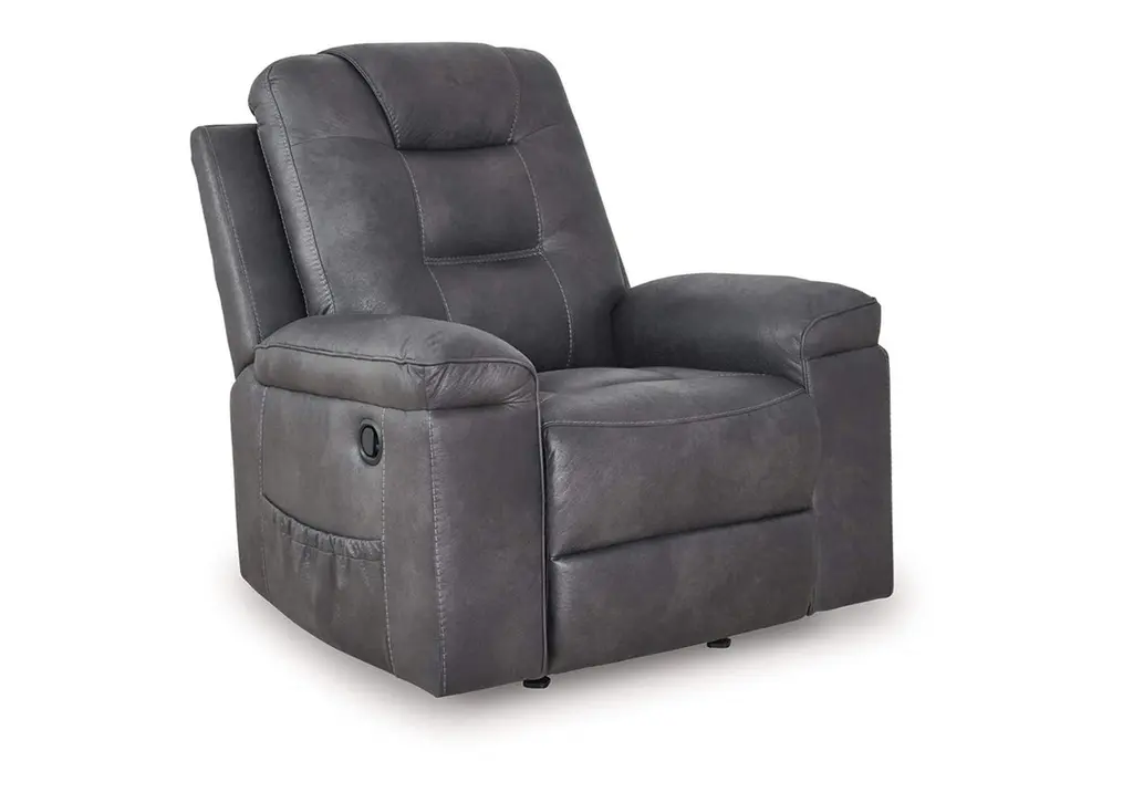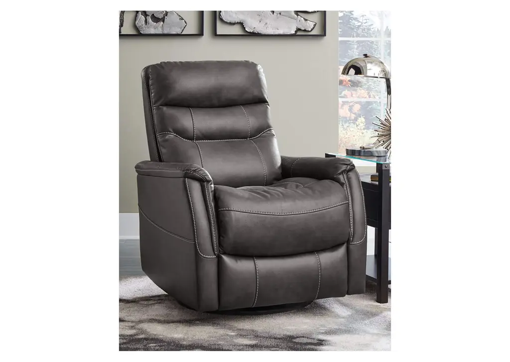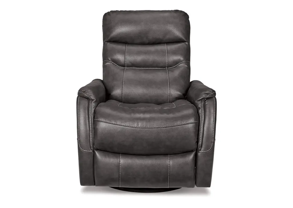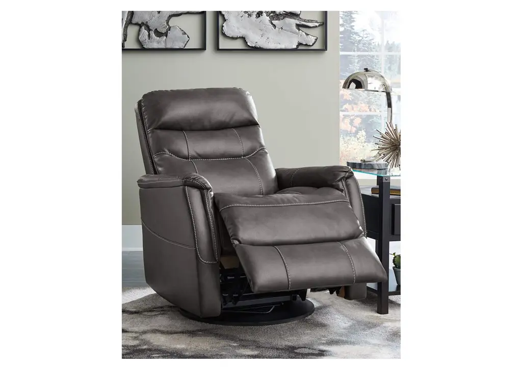 If you agree it’s high time for better form and function from your furniture, the Riptyme swivel glider recliner with gentle rocking motion might be just your style. Indulgently comfortable yet anything but bulky, its space-conscious design pairs slimmed-down armrests with a roomy seating zone for maximum comfort. Rest assured, the sumptuously cushioned 41" high back is head and shoulders above the rest. Thanks to an EZ Pull tucked discreetly inside the armrest, while this faux leather chair may be a recliner, it sure doesn’t look like one. Weight 118.000 lbs. (53.1kgs.)