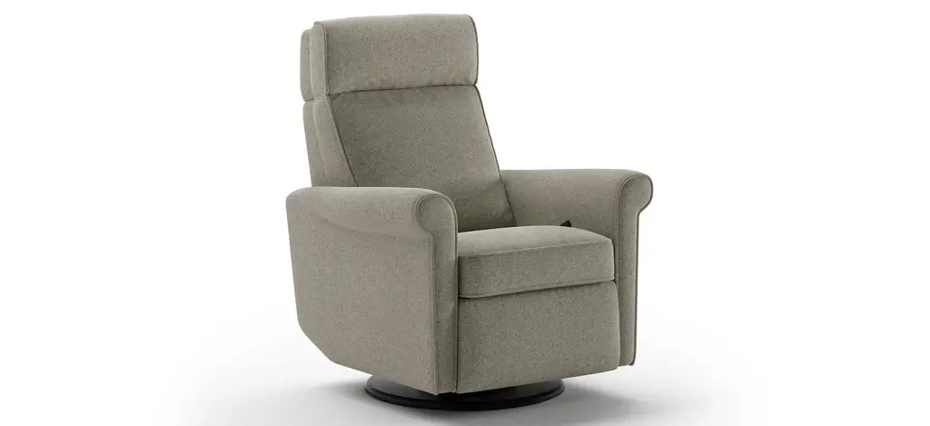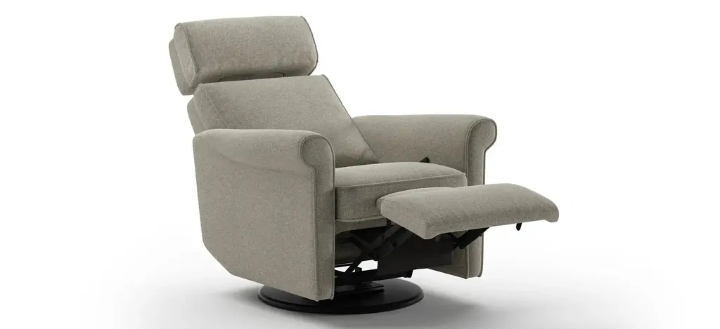 The Rolled manual recliner is a supportive and modern looking chair, this traditional rolled arm look provides the perfect addition to a room. With a 4-way adjustable headrest and swivel glider base, you can customize your comfort.