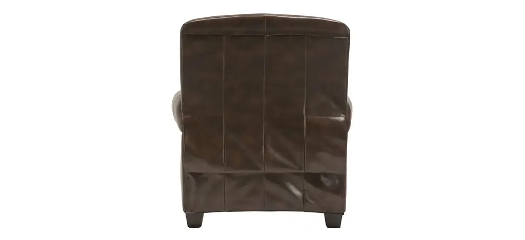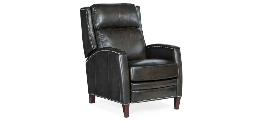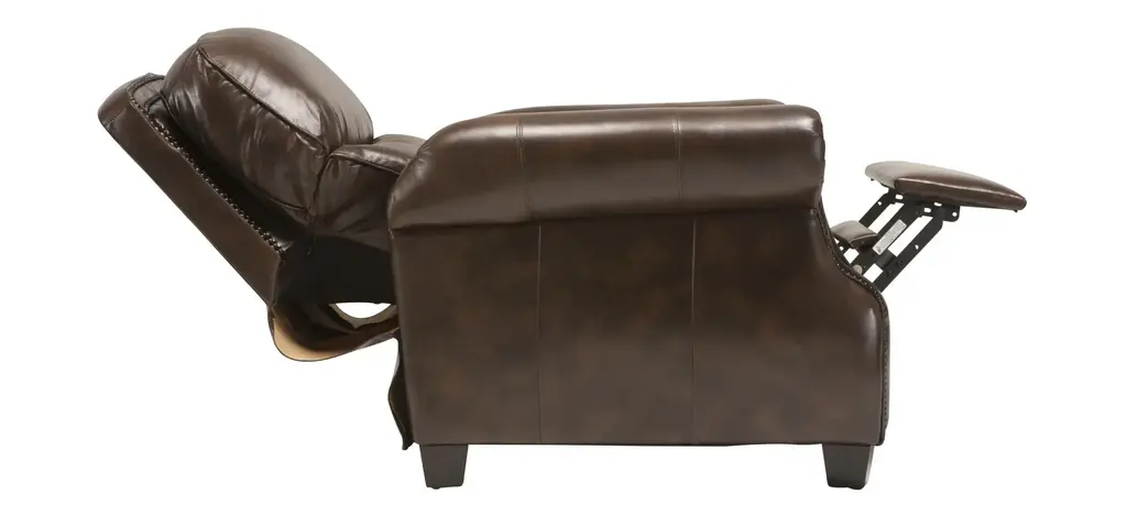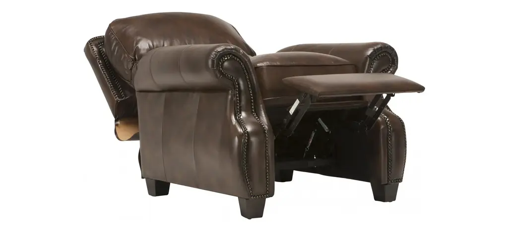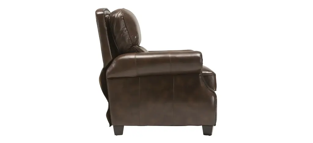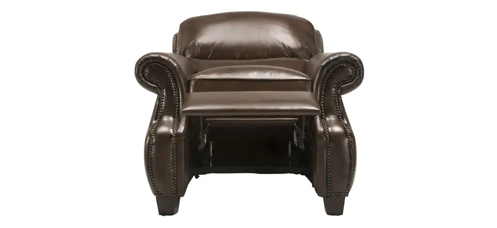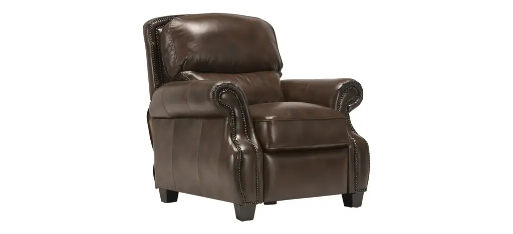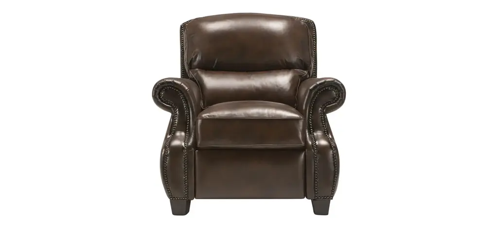 Taking its cues from the classics, this Romano leather recliner champions a timeless traditional look. Luxe leather upholstery in an antique tobacco color gives the recliner a distinguished vibe, while elegant touches, like roll arms, nailhead trim and topstitching, attest its exquisite attention to detail.