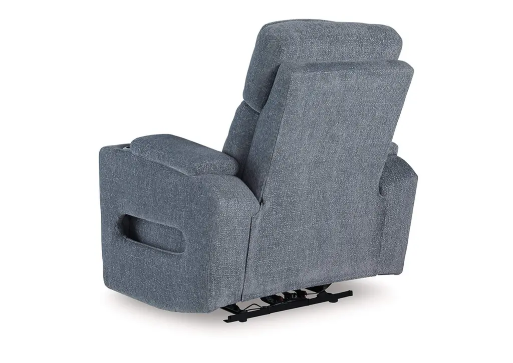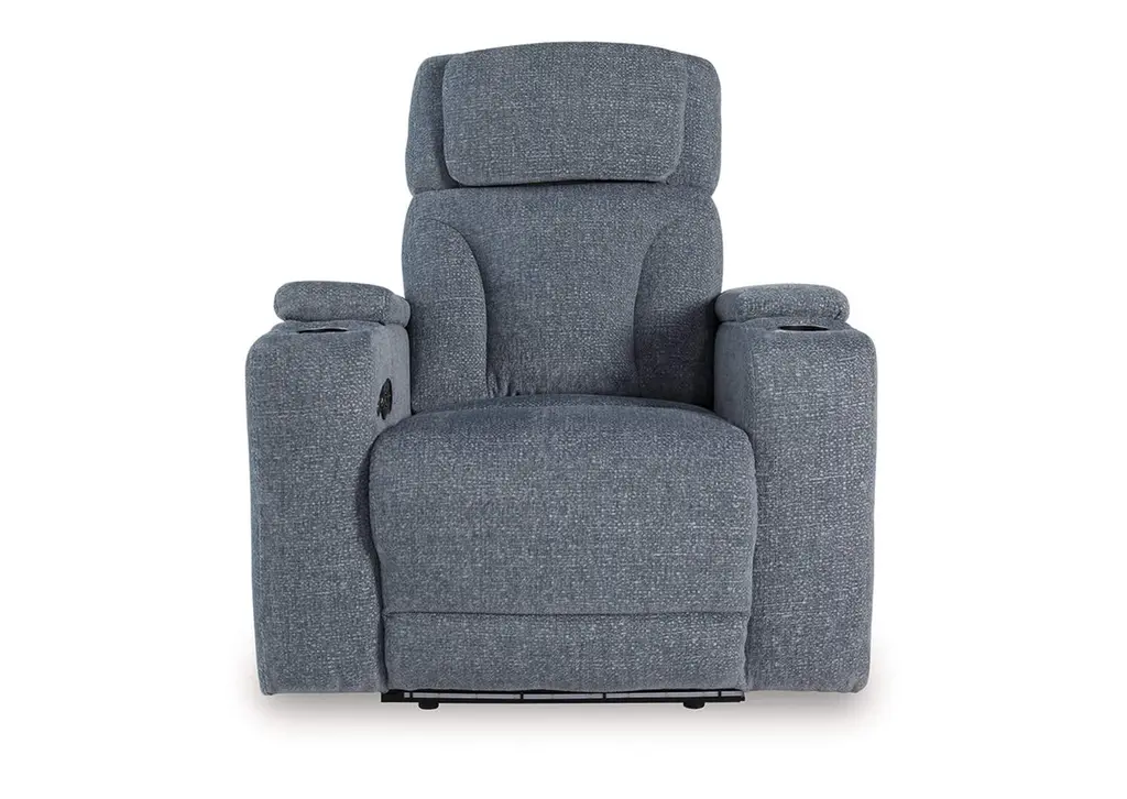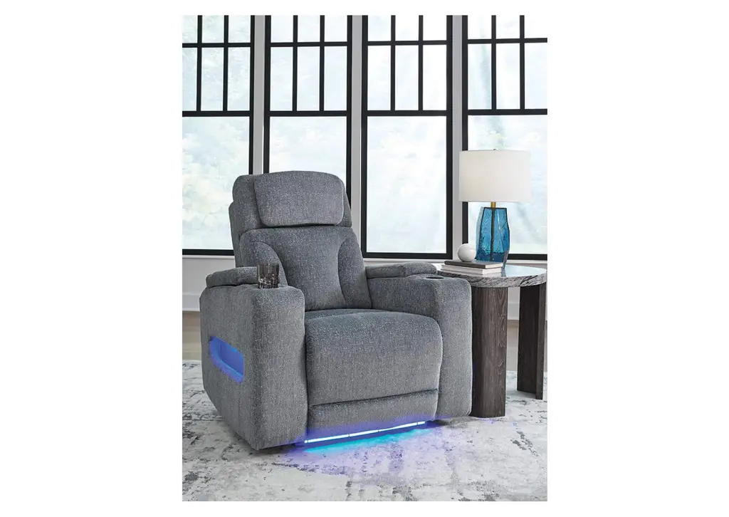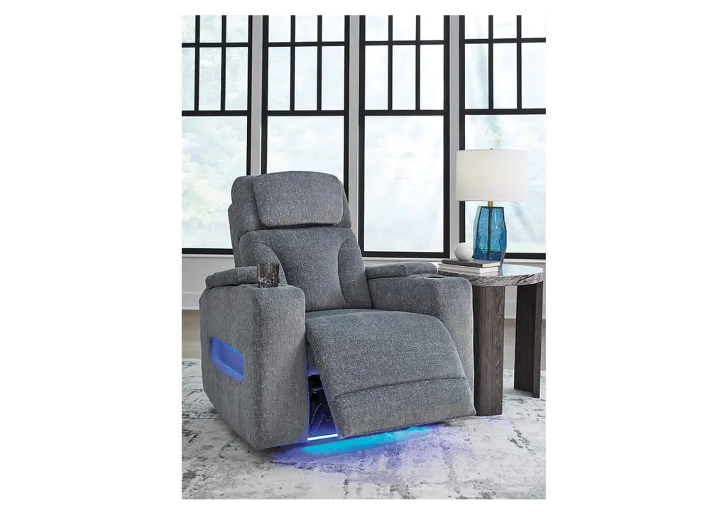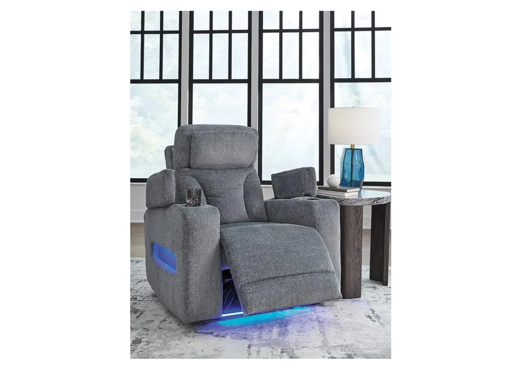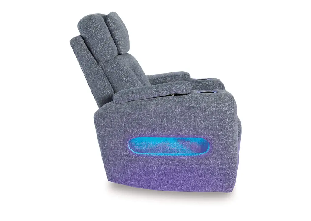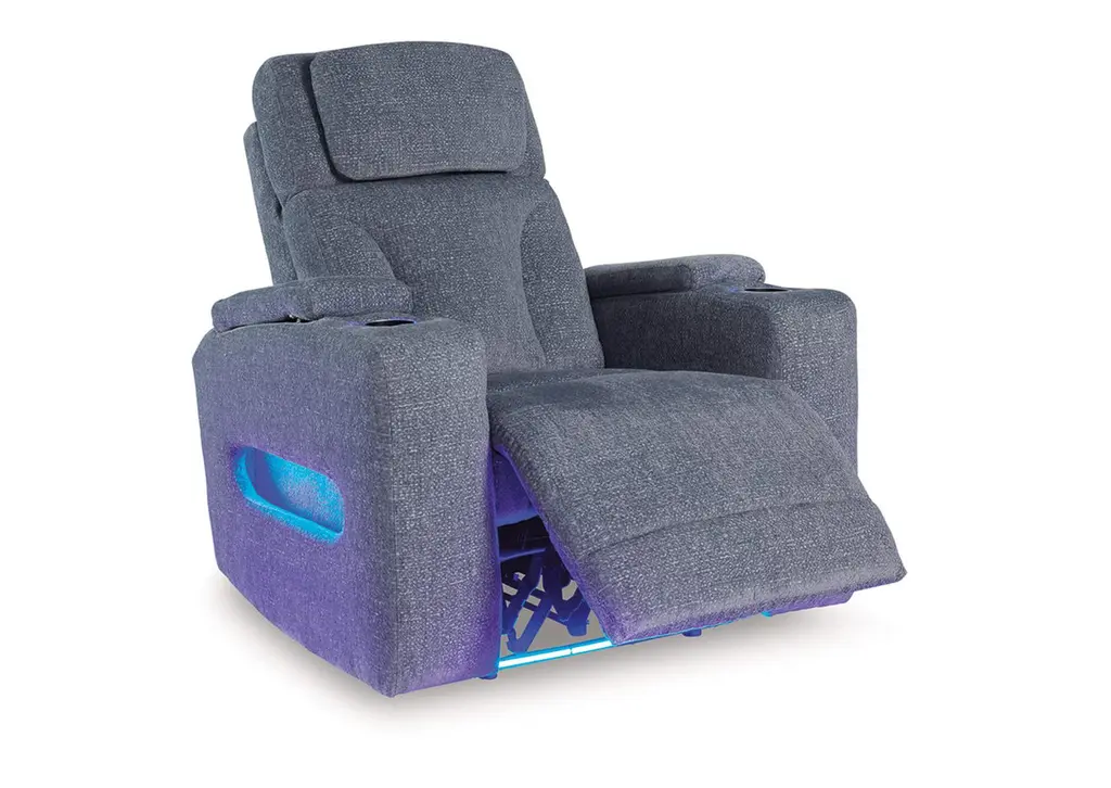 Chill-out time has never looked better. This power recliner's adjustable headrest ensures a perfect view of the TV no matter how far back you recline, while the extended ottoman takes your comfort to the next level. Handy charging features and storage cutouts put phones and e-readers at your fingertips. Plush yet practical Next-Gen Nuvella™ performance fabric and ambient lighting complete the theater-style experience. It's time to relax, nap or binge-watch in the best seat in the house. Weight 145.000 lbs. (65.25kgs.)