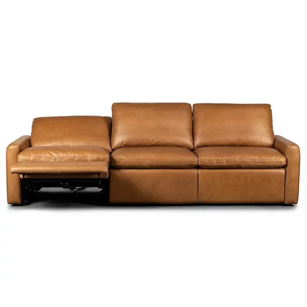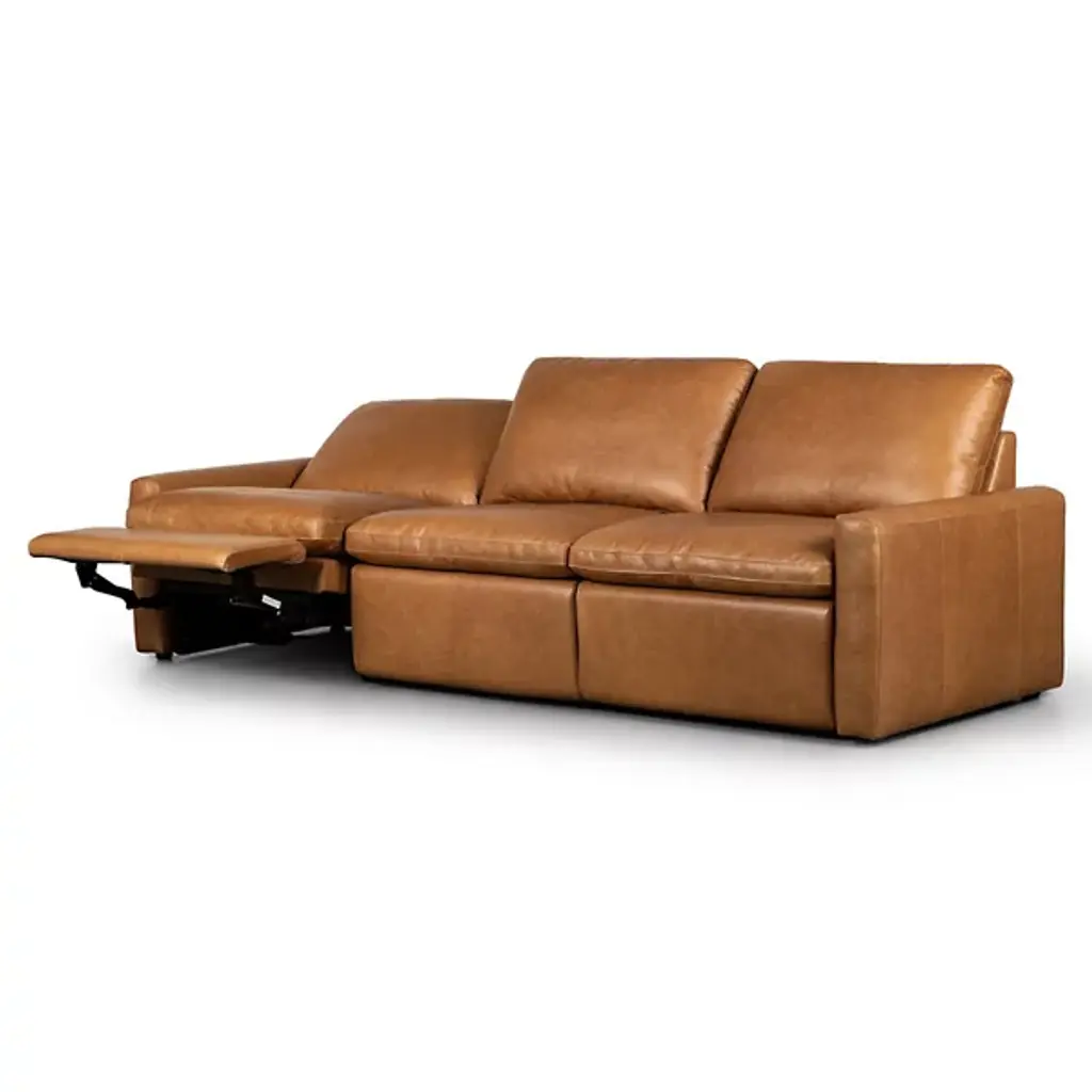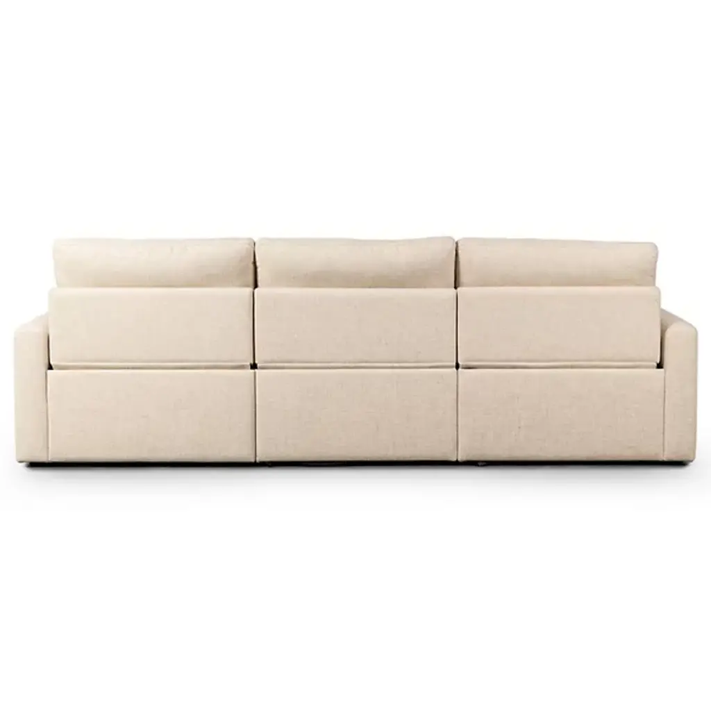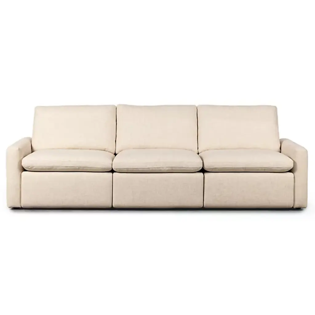 Upgrade your lounging experience with this modern recliner sectional from the Tillery Power Recliner 3-Piece Sectional Sofa from Four Hands. Adjust your comfort with hidden buttons, and enjoy features like a higher seat and backrest, low-profile arms, and a motion footrest. Plush feather-blend cushions add a relaxed, cozy feel, while performance fabrics resist spills, stains, and wear. The zero-clearance design fits snugly against walls. Includes a 9'5" power cord with up to six motors per outlet.