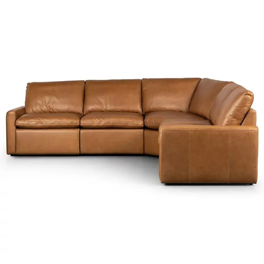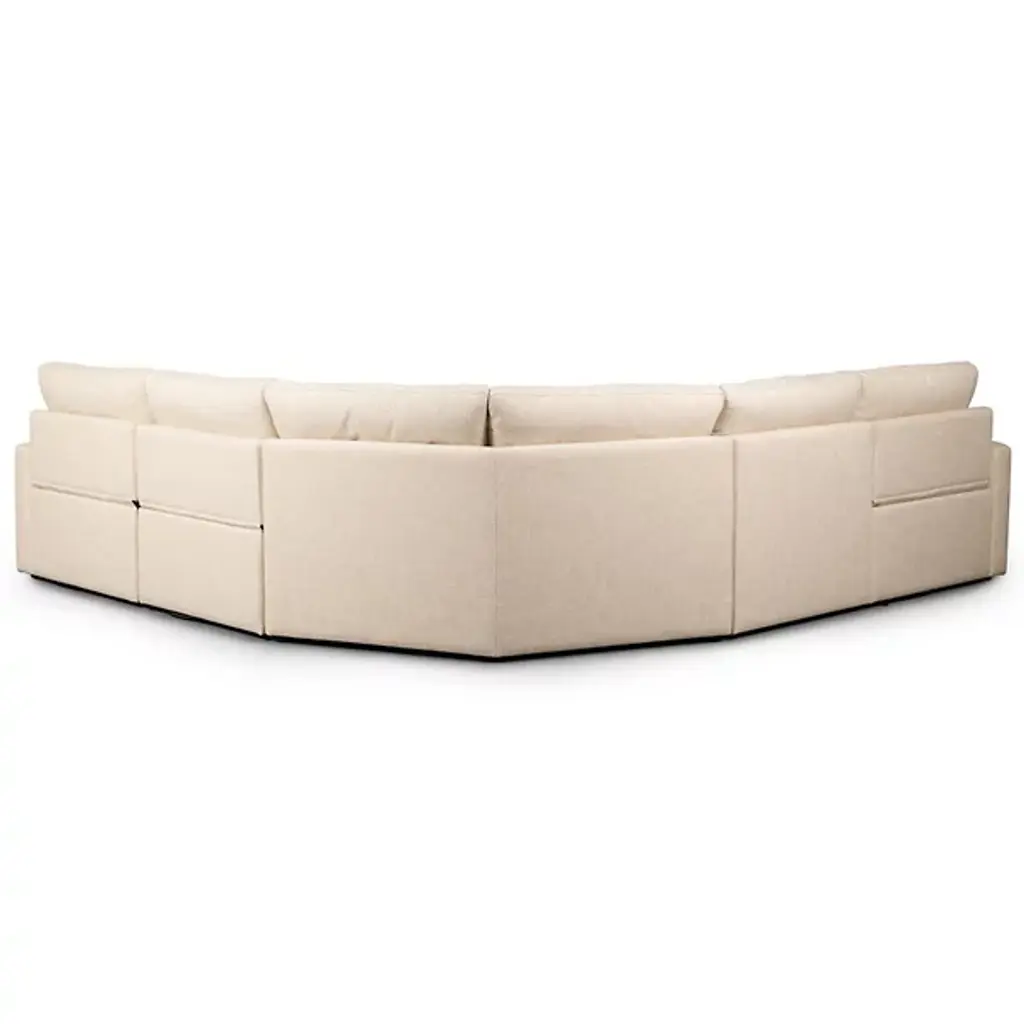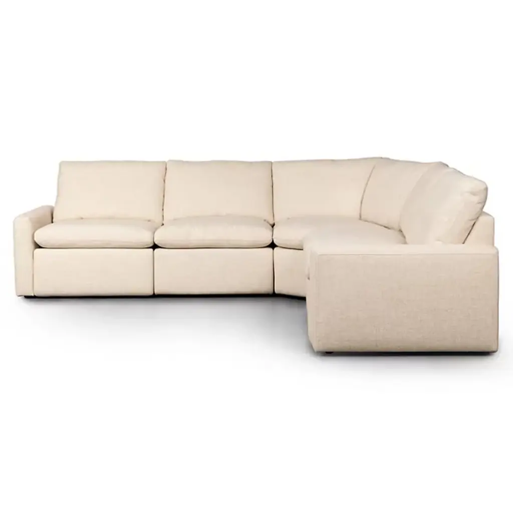 The Tillery Power Recliner 5-Piece Sectional Sofa by Four Hands combines modern design with personalized comfort. With elevated seats, a supportive backrest, low-profile arms, and a motion footrest, it balances style and function. The plush feather-blend cushions offer a cozy, relaxed feel, while performance fabrics protect against spills, stains, and wear for lasting durability. Its zero-clearance design lets it fit neatly against walls, making it a versatile and space-efficient choice for any home.