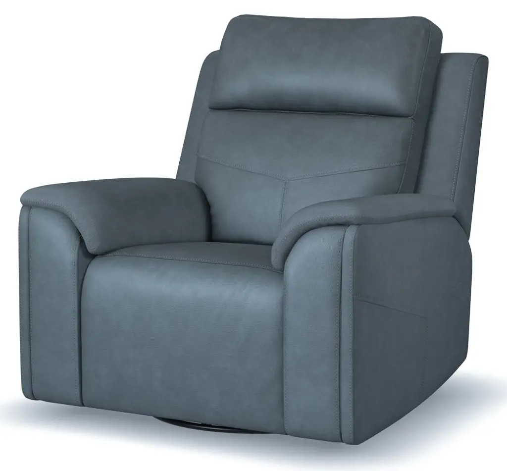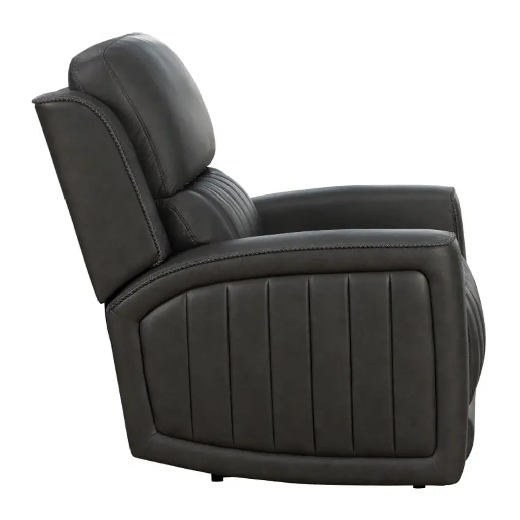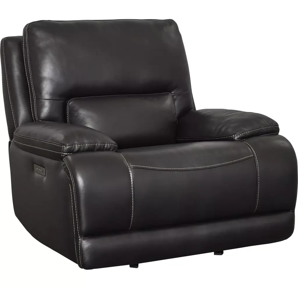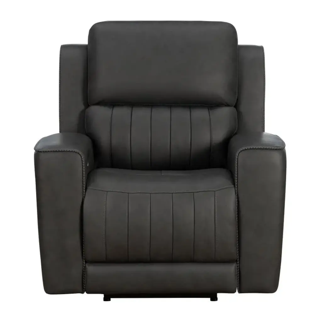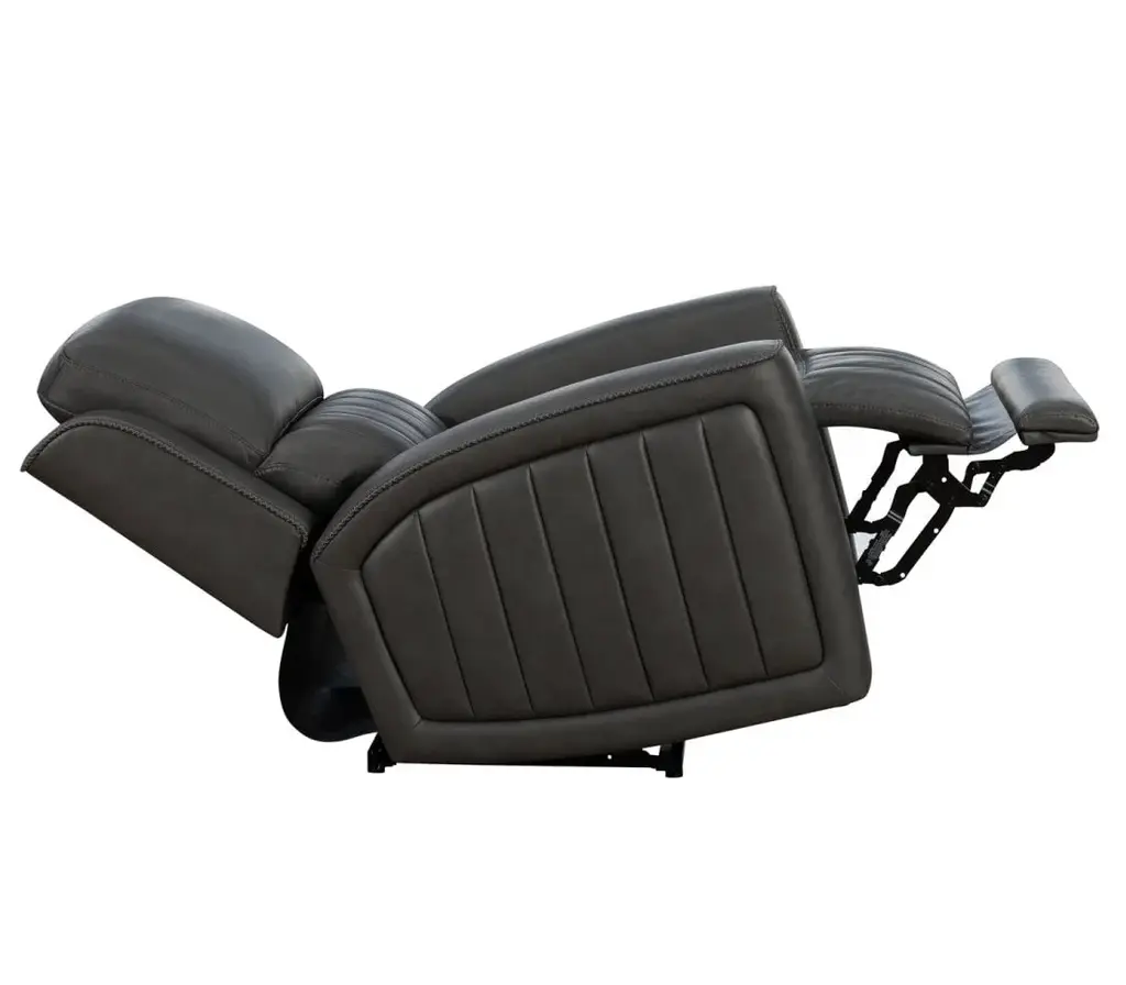 Sporty styling is found in this sophisticated modern reclining group. Features winged split pub channeled back with power headrest, power lumbar and drop-down table with 2 cup holders. Channeled pad over chaise pocketed coil seating fully supports your legs by eliminating pressure points. Large track arms with decorative whip stitching and welt details. Inside the arm power controller for easy access with USB port.