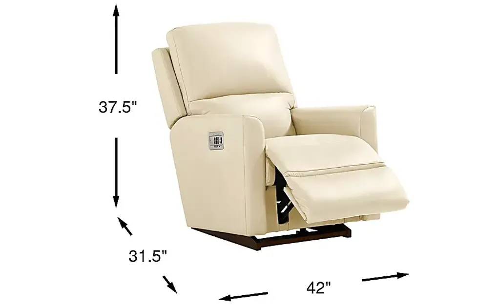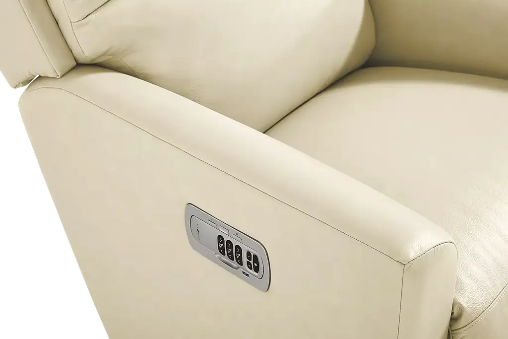 The comfort of stillness gets a serene reclining upgrade with the Wynne III recliner as it moves smoothly and supports luxuriously, accentuating its gracious curves and soft, sumptuous textures. With supple top grain leather where the body touches, this transitional recliner comes in a breath-taking ivory hue. Subtle wedge arms and pillowy cushions invite sinkable relaxation, while deep tufting and top-stitched seams add tailored refinement. The unique dual power reclining mechanism includes a footrest, backrest and headrest that can be controlled independently. Set into the arm is a charging cradle with a wireless remote and USB port. If the remote happens to run off and hide, a "find me" feature inside the cradle ensures you can relocate it. Two memory buttons mean your favorite reclining positions are available at a moment's notice. Easily return to an upright position with the home button and continue to get comfortable by enjoying the gentle rocking motion. Upholstery: Top grain leather where the body touches with polyurethane sides and back.