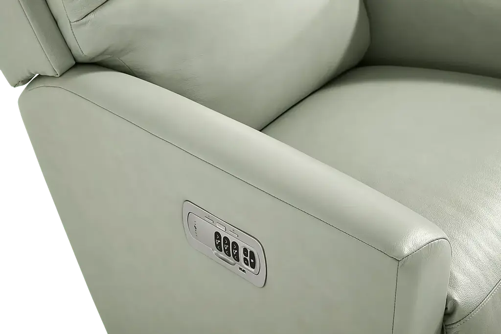 The comfort of stillness gets a serene reclining upgrade with the Wynne III recliner as it moves smoothly and supports luxuriously, accentuating its gracious curves and soft, sumptuous textures. With supple top grain leather where the body touches, this transitional recliner comes in a breath-taking seafoam hue. Subtle wedge arms and pillowy cushions invite sinkable relaxation, while deep tufting and top-stitched seams add tailored refinement. The unique dual power reclining mechanism includes a footrest, backrest and headrest that can be controlled independently. Set into the arm is a charging cradle with a wireless remote and USB port. If the remote happens to run off and hide, a "find me" feature inside the cradle ensures you can relocate it. Two memory buttons mean your favorite reclining positions are available at a moment's notice. Easily return to an upright position with the home button and continue to get comfortable by enjoying the gentle rocking motion. Upholstery: Top grain leather where the body touches with polyurethane sides and back.