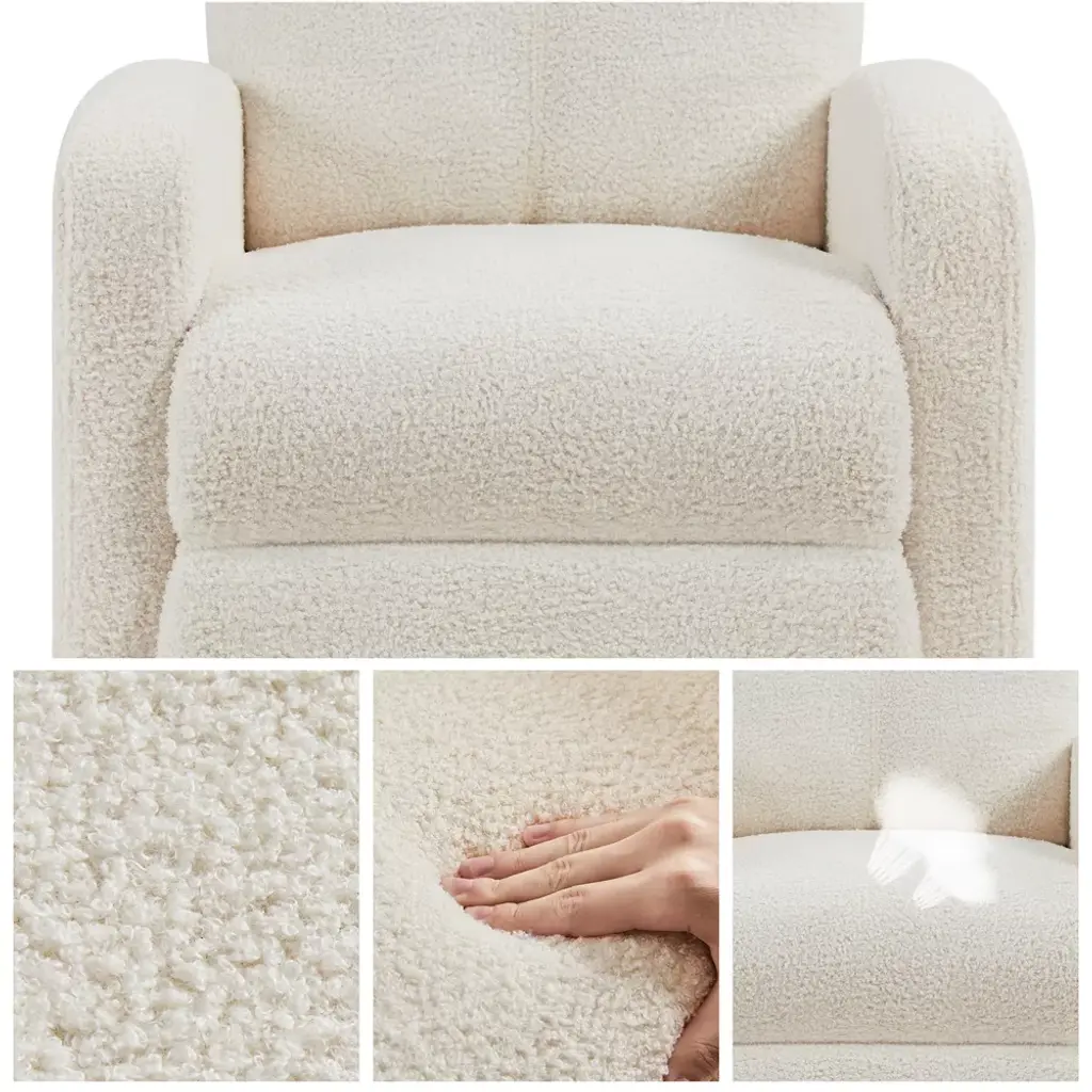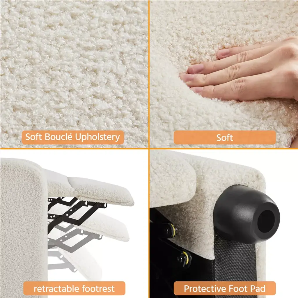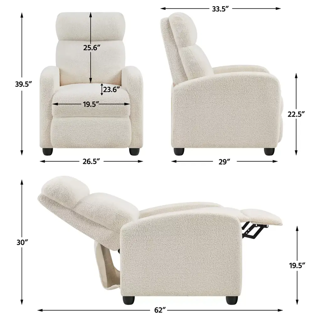 It has a robust engineered wood frame, multiple padding materials including thick foam, fiberfill, sinuous springs and pocket spring, and soft-to-the-touch polyester boucle upholstery. The solid structure can easily bear up to 120 kg / 265 lb. The super soft seat, armrest, backrest and footrest reduce fatigue after a long day at work, providing you with an amazing seating experience. This recliner is a fantastic addition to your living room, bedroom, home theater, office and more. Specifications: Color: Ivory, Cream, BlackMaterial: Polyester Boucle Fabric, Engineered Wood, Foam, FiberfillOverall dimensions: 26.5" W x 33.5" D x 39.5" HFully reclined dimensions: 26.5" W x 62" D x 30" HSeat depth: 23.6"Seat width: 19.5"Backrest: 19.5" W x 25.6" HArmrest width: 3.5"Armrest height: 22.5"Legs distance: 26.5", 29"Footrest: 20" L x 15.7" W x 19.5" HFootrest adjustable angle: 0-90°Maximum weight capacity: 265lb Please see the image for exact measurements.