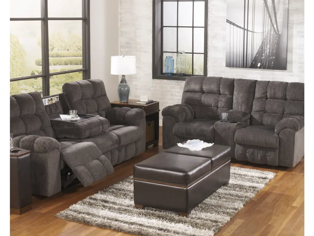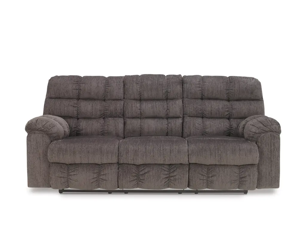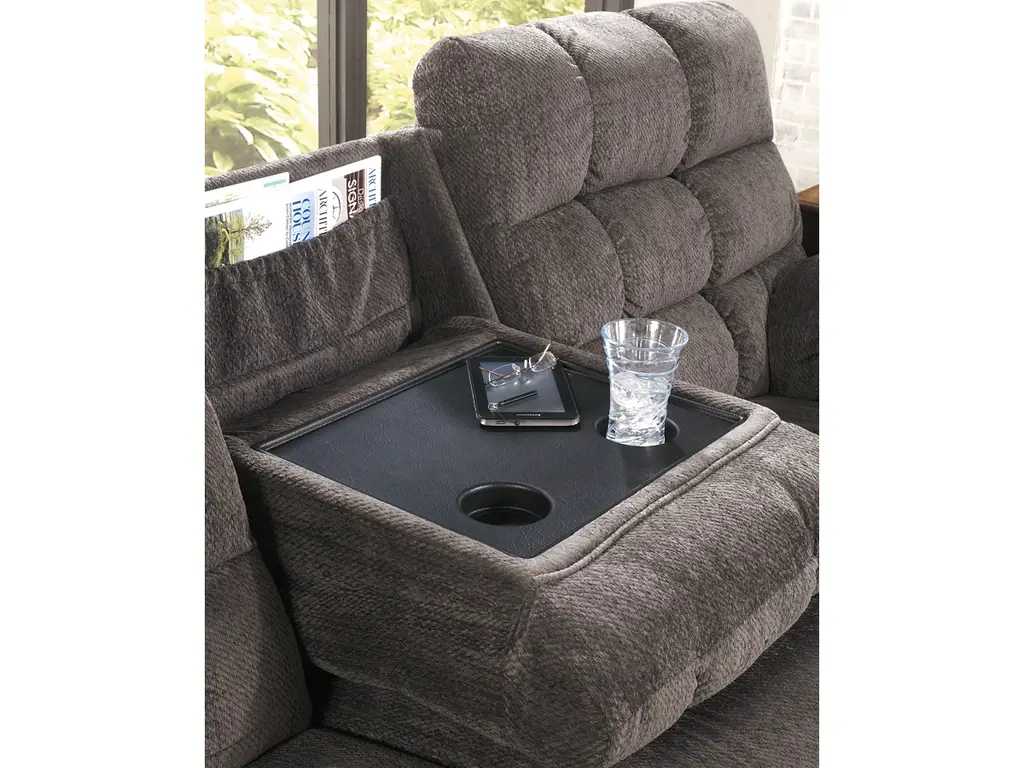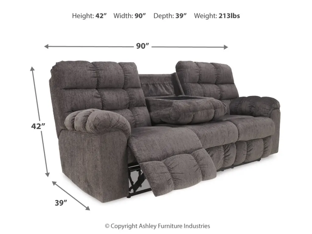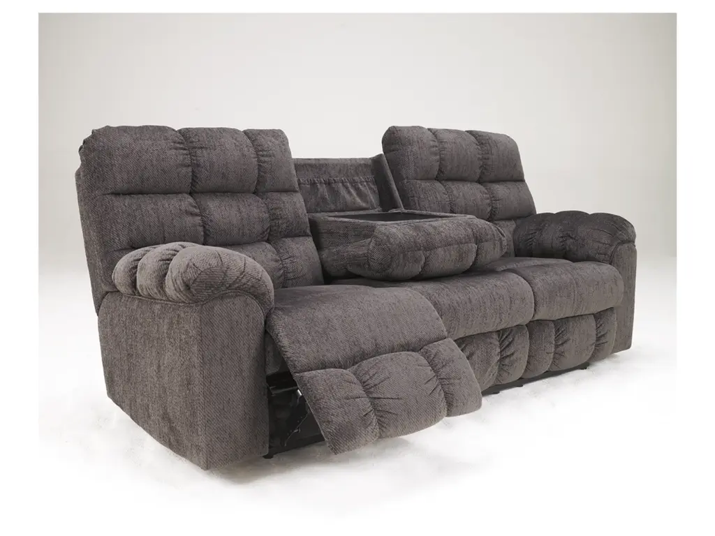 If its quilted bustle back weren’t enough, the Acieona reclining sofa has overstuffed arms that elevate comfort to new heights. Drop down the middle seat’s back to reveal a handy table top and cup holders, as well as an ingenious storage pocket. Ultra-soft chenille upholstery makes this piece beyond luxurious.
