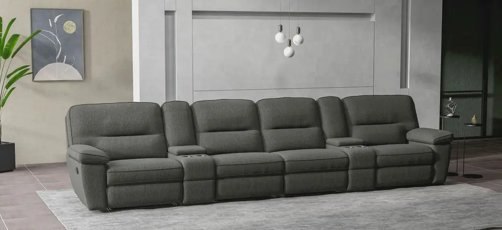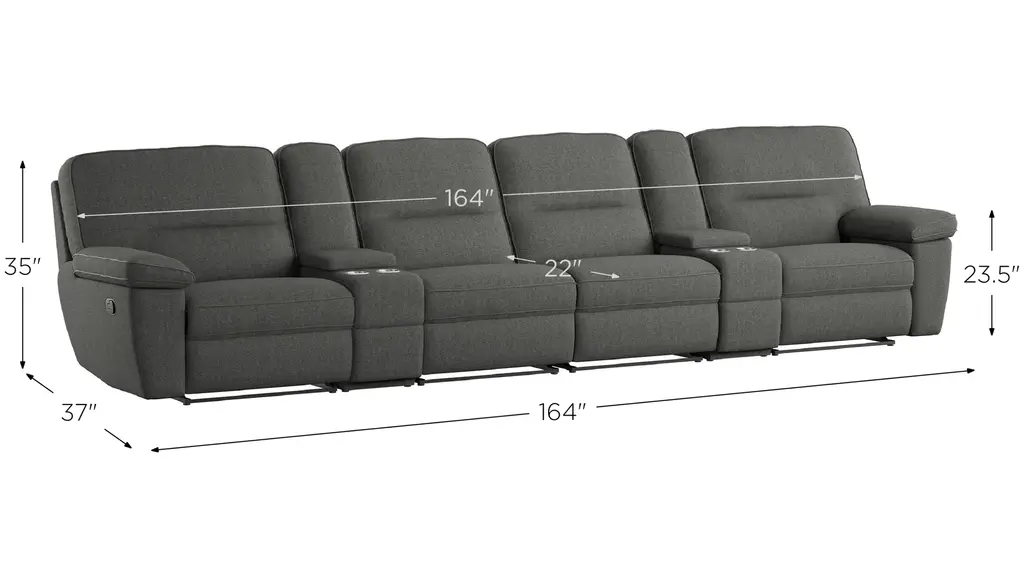 With an updated take on the traditional recliner sofa, the Alberta 6-pc. modular reclining sofa sectional marries old fashioned comfort with current style. Contemporary & Modern charcoal gray, piped edging, and a modern approach to pillow tufting all come together to create this transitional set. Convenient handles tucked between the cushions allows the middle seats to also recline. Two consoles with stainless steel cupholders turn this sofa into the home theater must-have. The modular design of the Alberta allows the console, armless chair, and armless recliner to fit where you need it and the comfort will ensure it is everyone's favorite place to be.