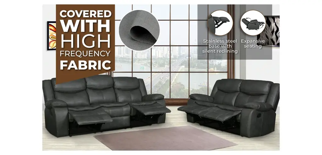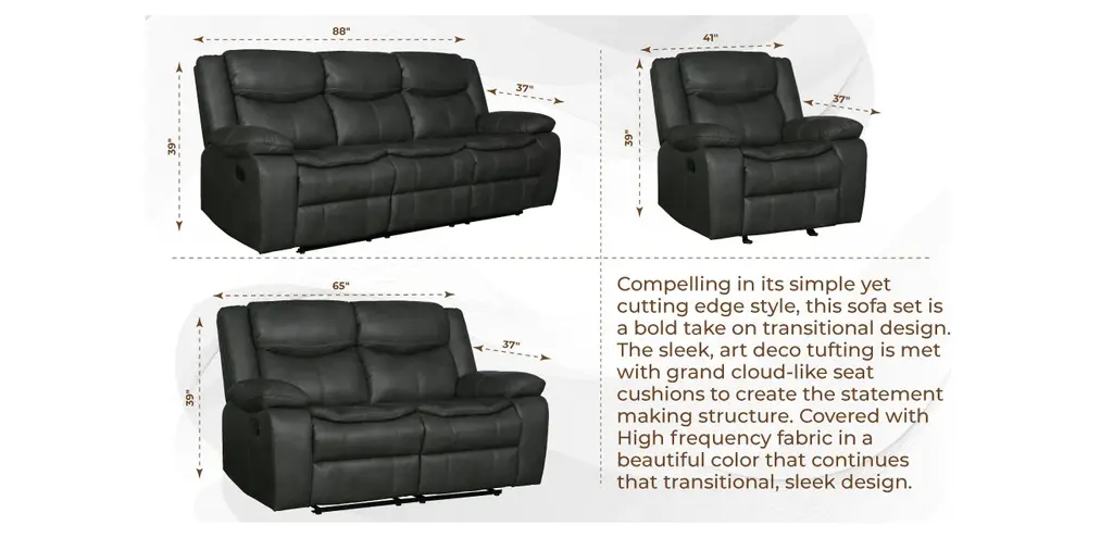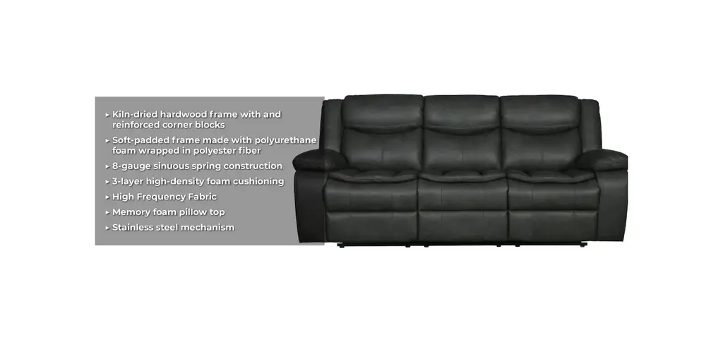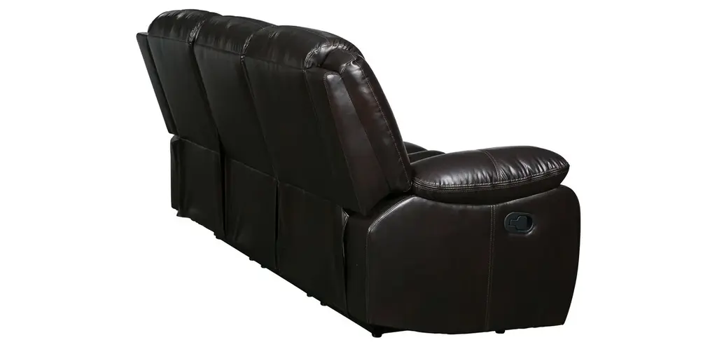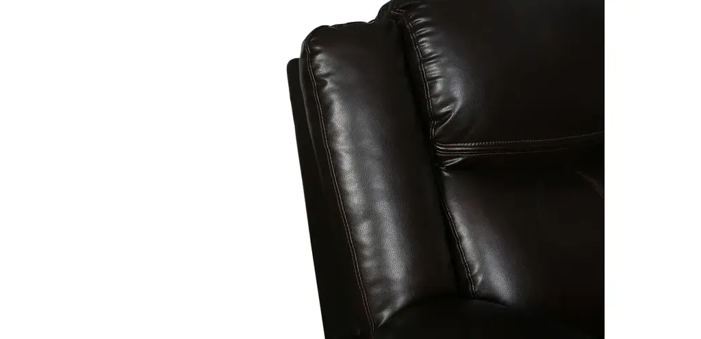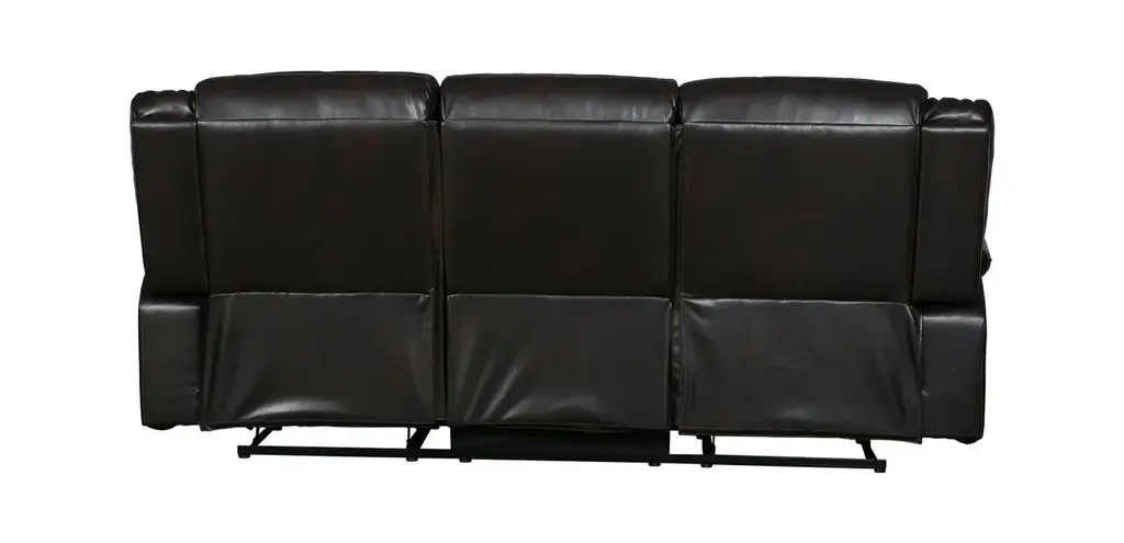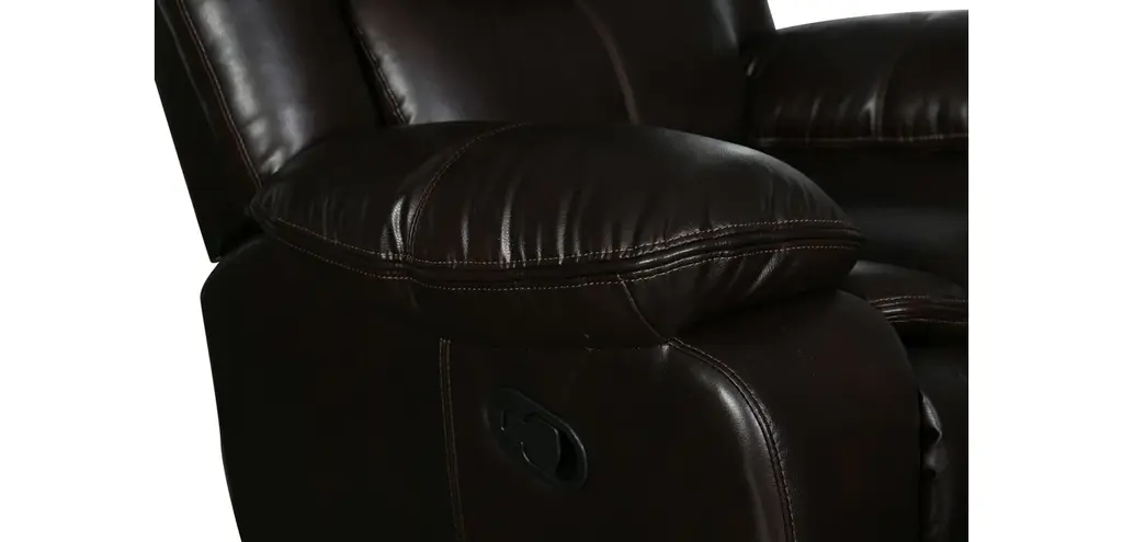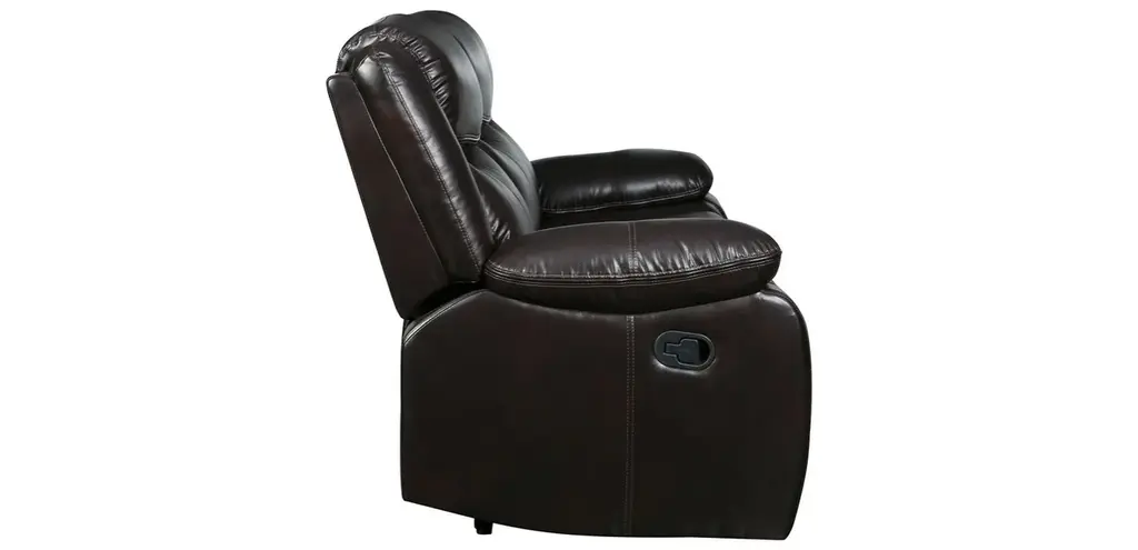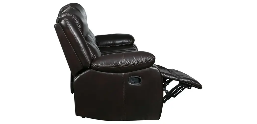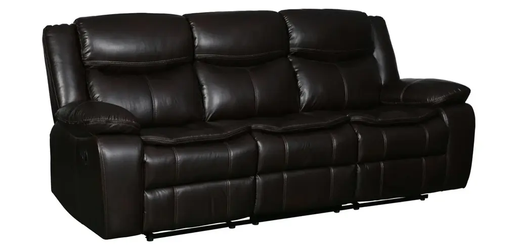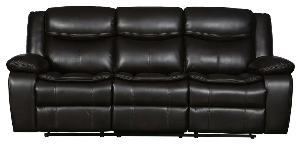 Simple yet elegant, Arlington Contemporary Brown Leather Air Reclining Sofa offers comfort, and appeal effortlessly. A truly remarkable large sofa for the modern or traditional home, the Arlington collection of reclining living room Sofa provides immense seating space, ample and comfortable padding, the ability to Recline and a touch of class for your living room. It will be one of the pieces in your living room that will define its mood and comfortable ambiance. It features a modern design with substantial proportions, a long comfortable seat area, a broad supporting backfilled with high-density foam and a manual reclining system which is easy to operate.Contemporary StyleLeather Air upholsteryRecliners: YesReclining Mechanism: RMTFrame Construction: Wood And PlywoodSeat Construction: Pocket Coil With FoamFoam Depth:Seats 2.8 / Armrest And Footrest 2.0Back Construction: Webbing with fiber