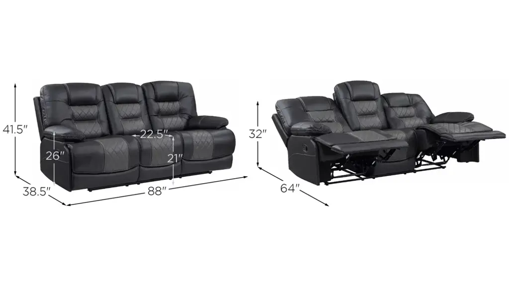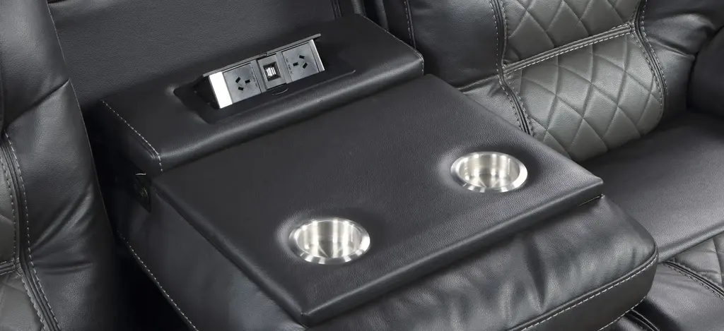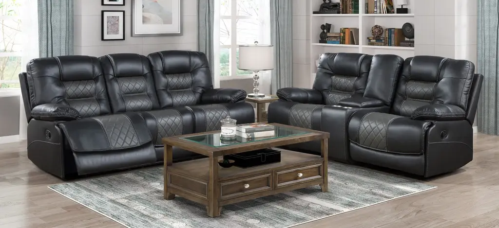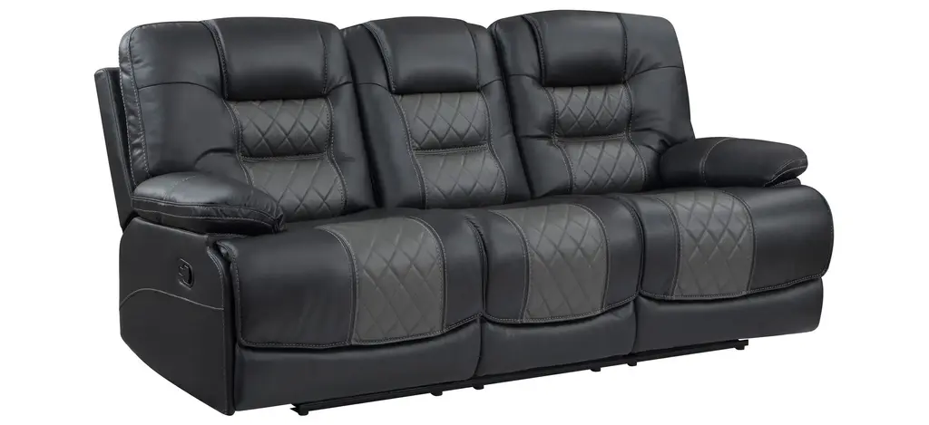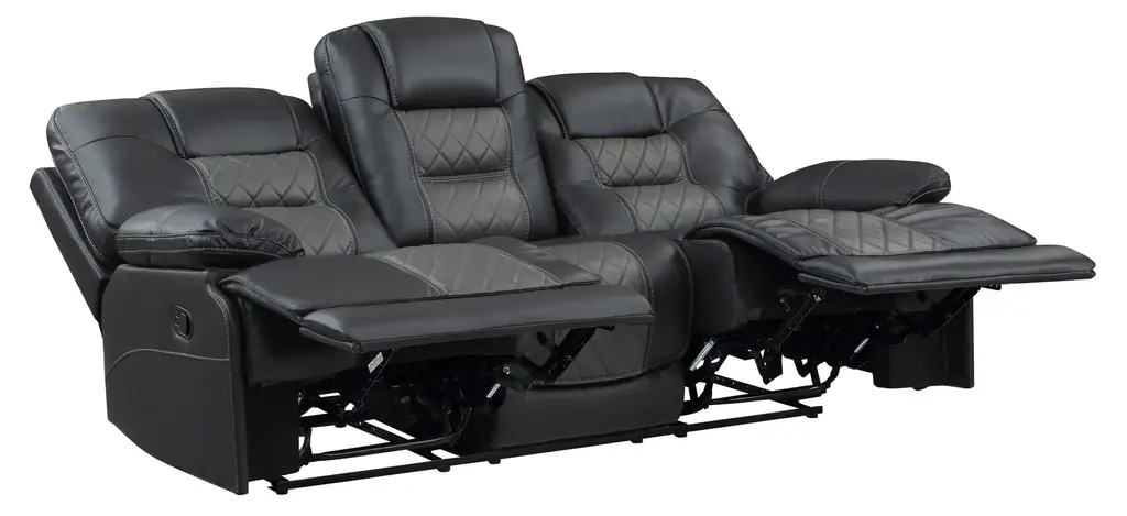 The transitional profile of the Bree Double Reclining Sofa is given a modern edge with the diamond stitching of the seats and electronic conveniences. The sofa features manual reclining mechanisms allowing for ease of motion when going from seated to reclined. The sofa's drop-down seatback that has cupholders, tabletop, receptacles, and USB ports. Breathable faux leather upholstery is featured in a complementing contrast of two-tone gray for perfect pairing to your home's decor.