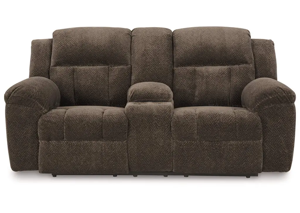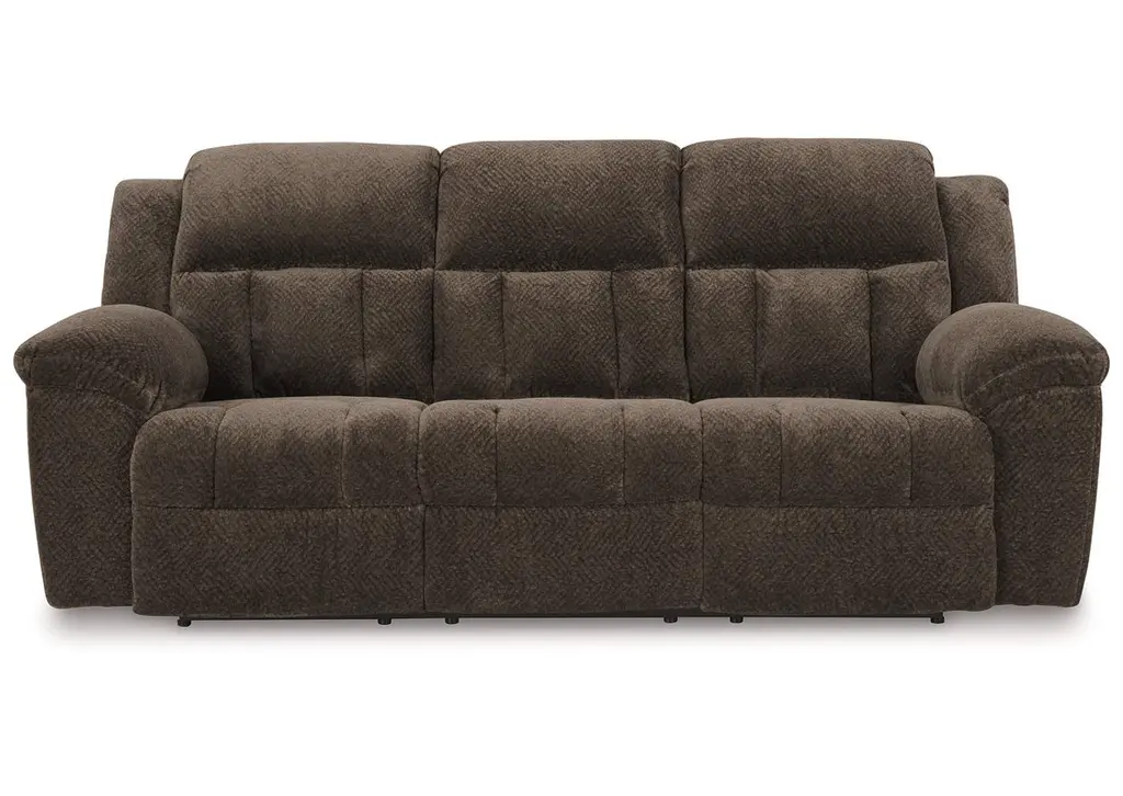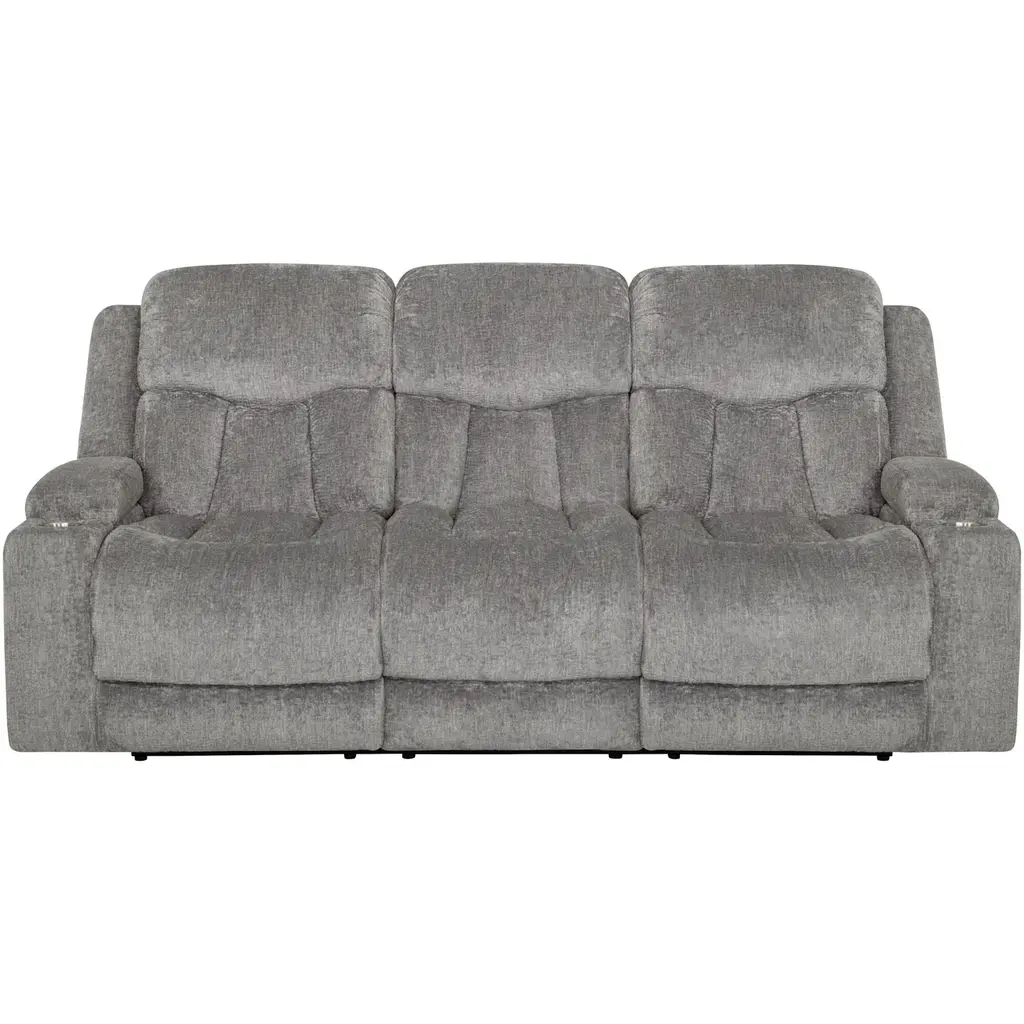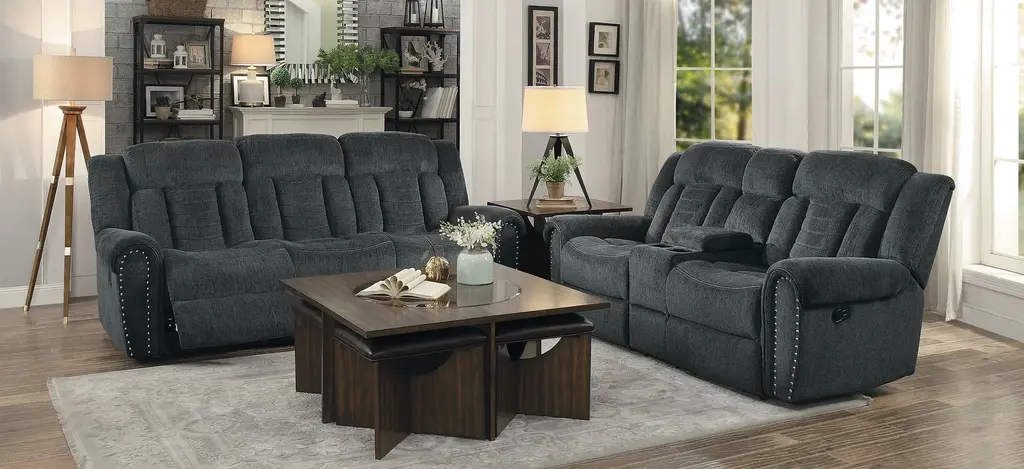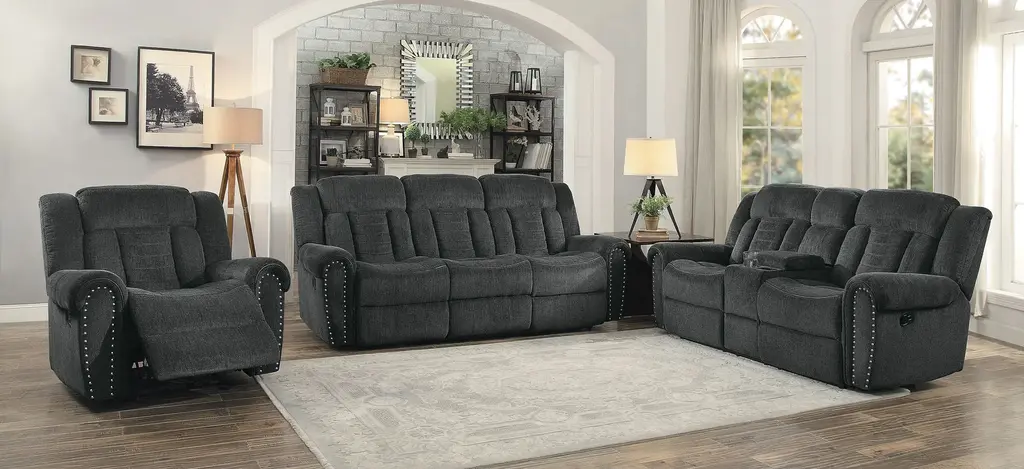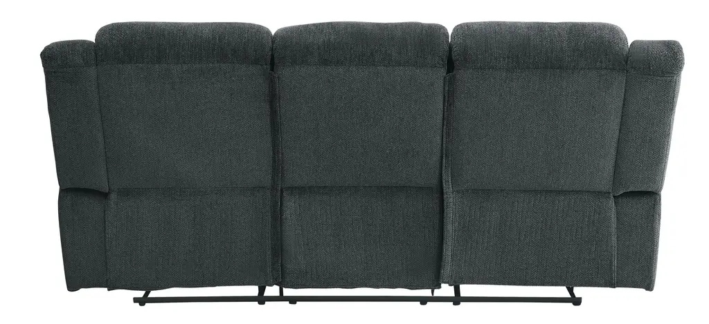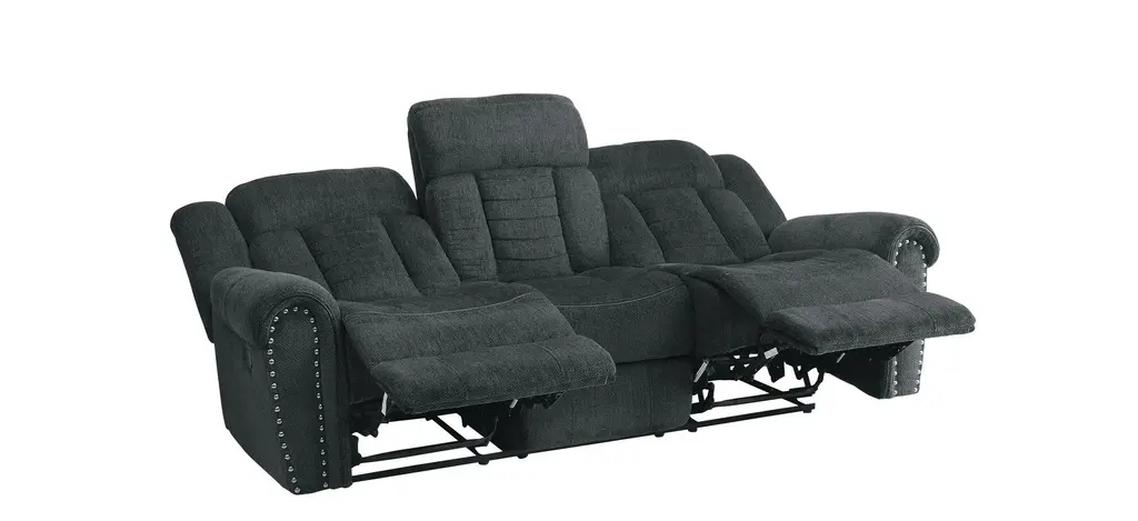Designed for maximum comfort and styled for the transitional home, the Casella reclining sofa is a study in comfort. Contoured seating cradles you as you relax into the plush seatbacks. Charcoal gray textured fabric is highlighted by nailhead accent and contrast contour welt, defining the profile of the collection. Manual motion mechanisms operate with the pull of a side-mounted tab, that once engaged, take you from seated to reclined in an easy motion.