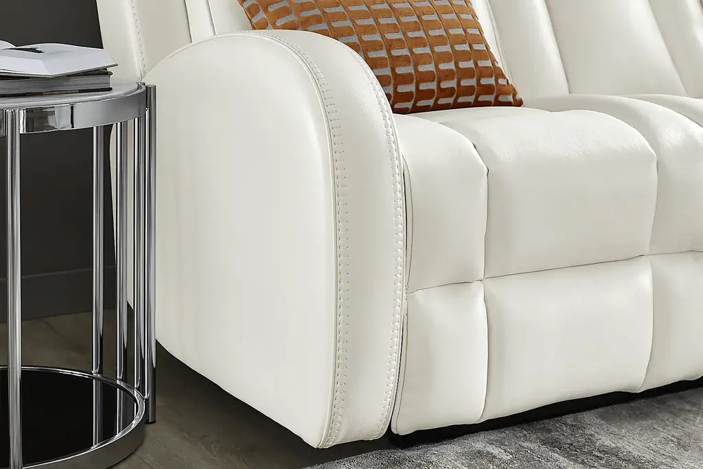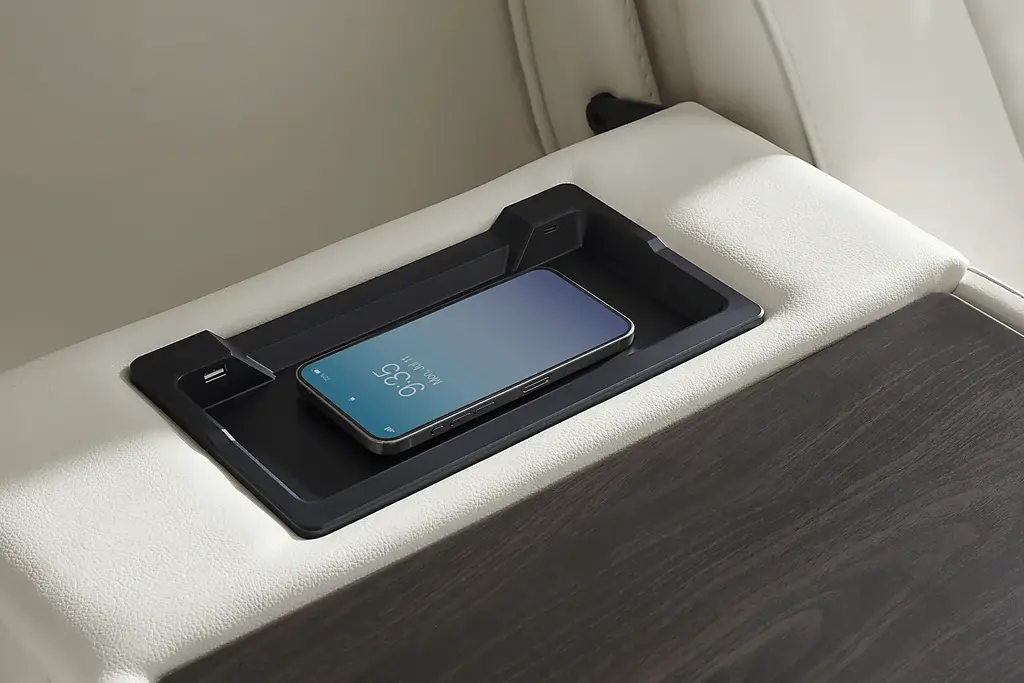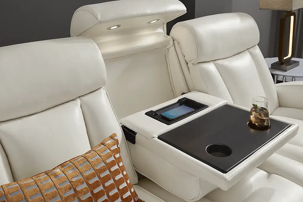 The plush pocketed design and soothing feel of the Copperfield sofa makes relaxing together a warm, connected experience. Traditional in style, this piece features soft, padded arms and adjustable head and footrest option with zero gravity reclining technology that puts your feet above your head for a weightless lounging experience. The middle back folds down into a functional console with LED lights, cupholders and a wireless charging pad for optimal convenience while you unwind. Upholstery: 88% Polyester, 12% Polyurethane