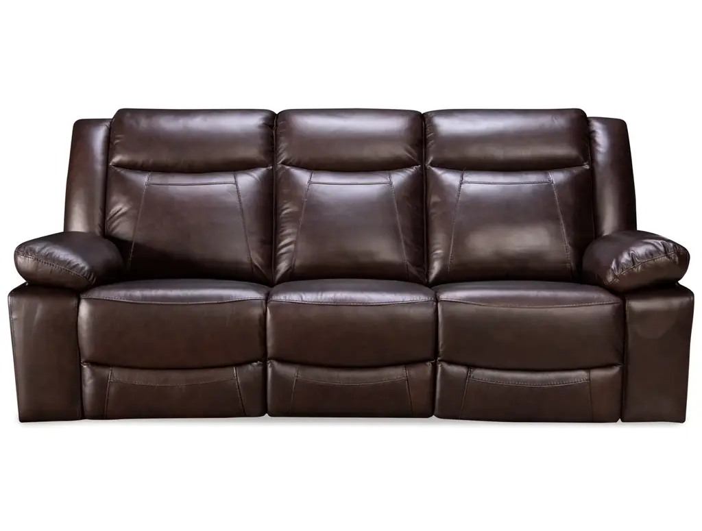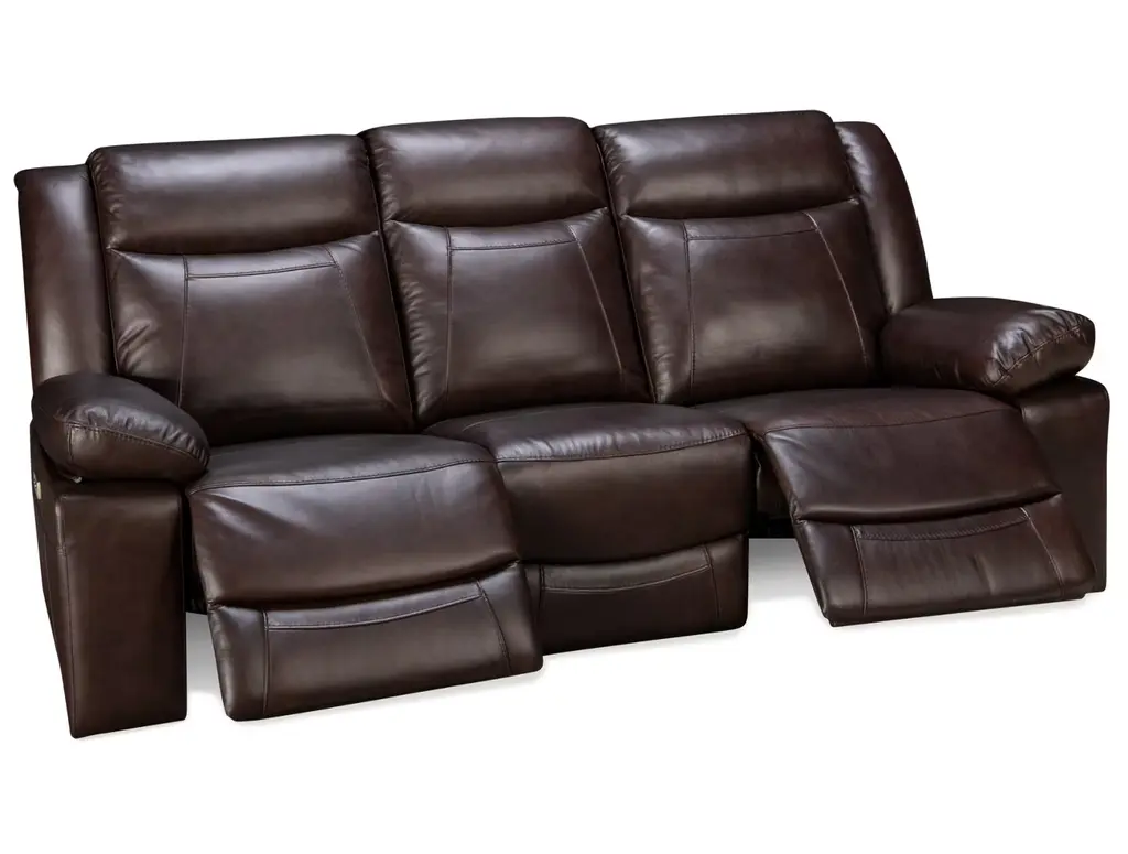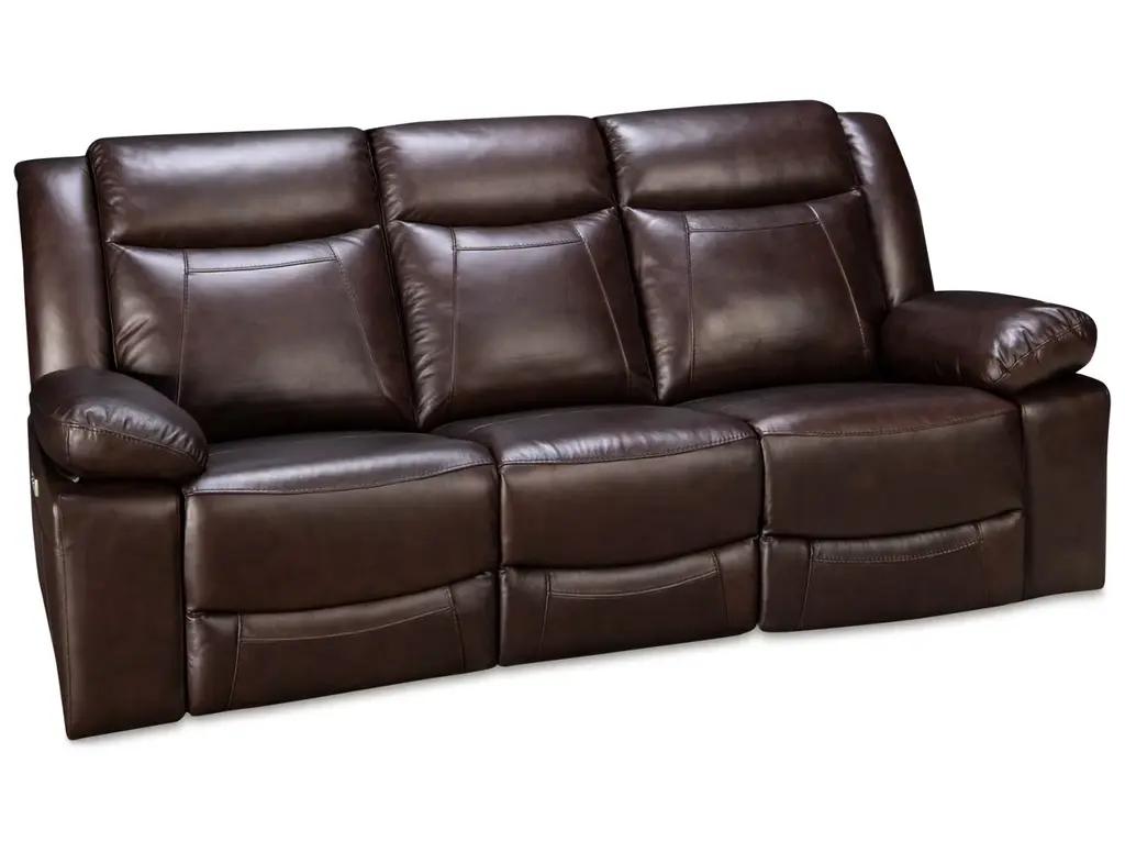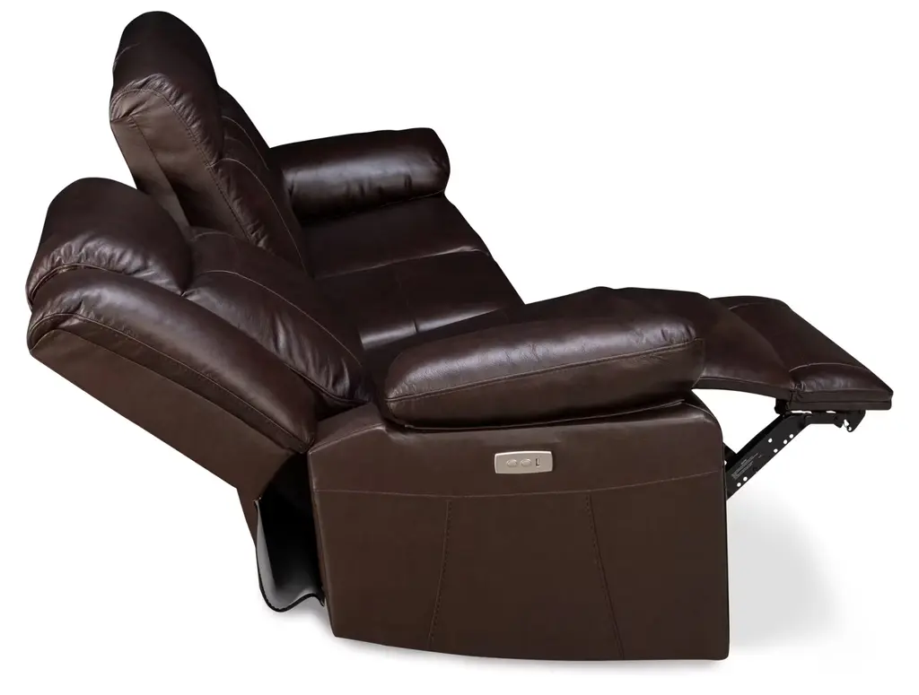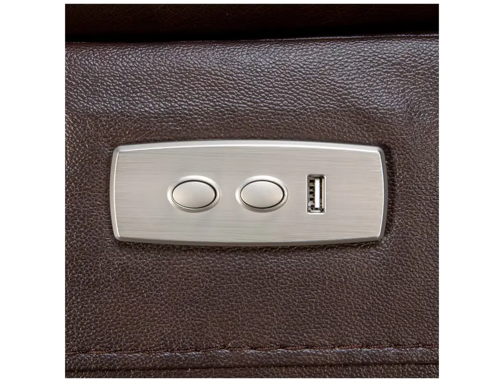 Relax in luxurious comfort with this Leather Power Sofa Recliner from Kuka Furniture. This traditional-style leather sofa features smooth brown leather upholstery with padded arms, and channeled backs and footrests. View your favorite programs sitting upright or recline and take a nap at the touch of a button. A convenient USB port lets you charge your electronic device while you recline.