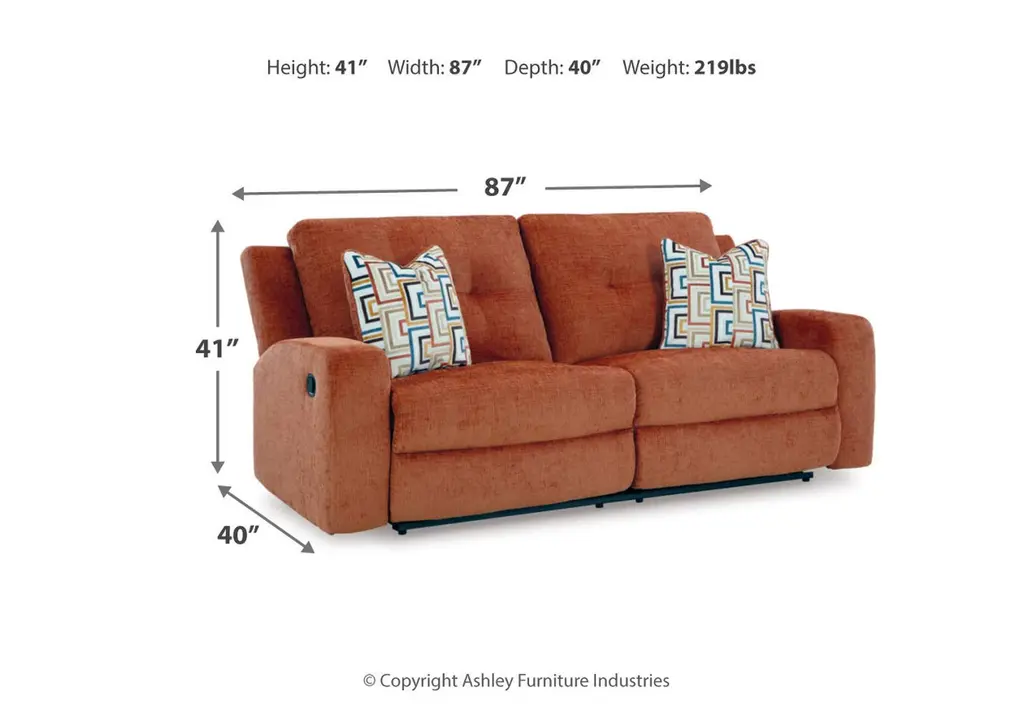 The Danum reclining sofa invites you to a luxuriously soft lounging experience. The chic hue fits right in with contemporary color palettes. A tufted back keeps the look right on trend. Balancing style and function, its pull tab reclining effortlessly takes you to relaxation mode. Weight 219.000 lbs. (98.55kgs.)