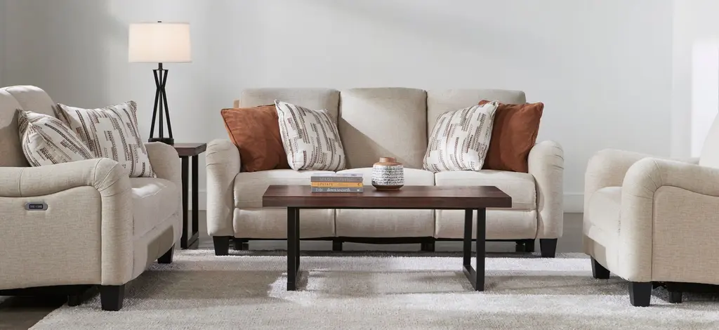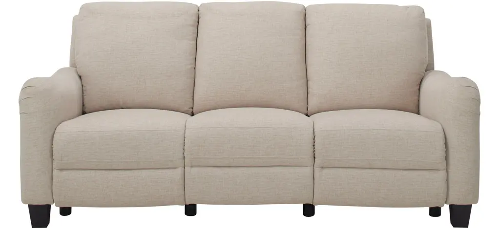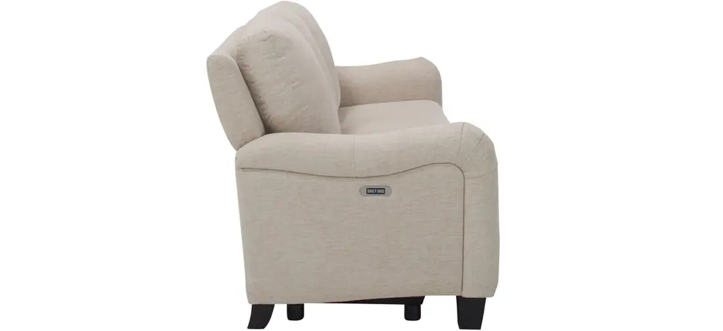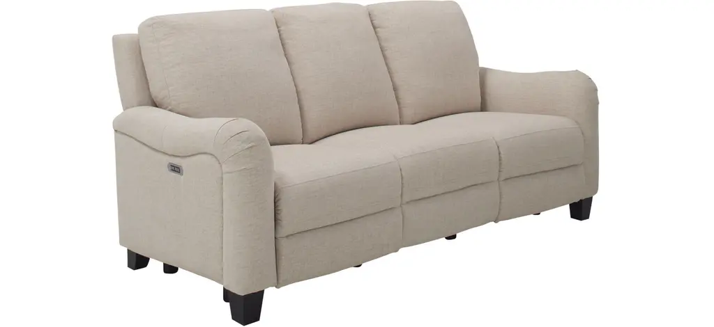 The Dillon Leather Power-Reclining Sofa provides welcoming farmhouse style for your living room. Recline in cozy comfort as you relax on its soft upholstery. Pleated arms and down blend throw pillows add to the appeal.