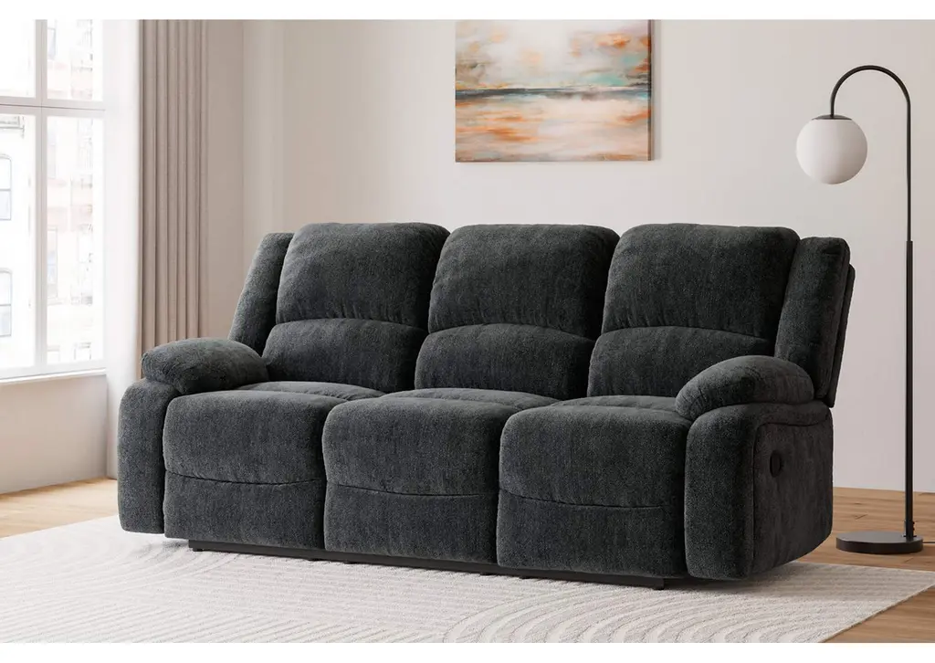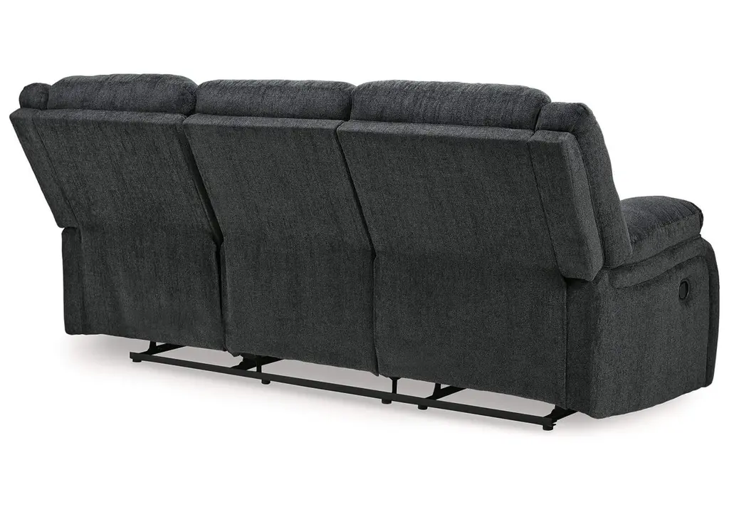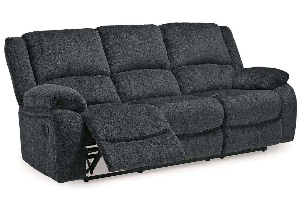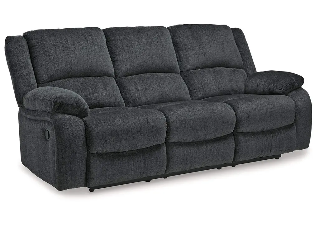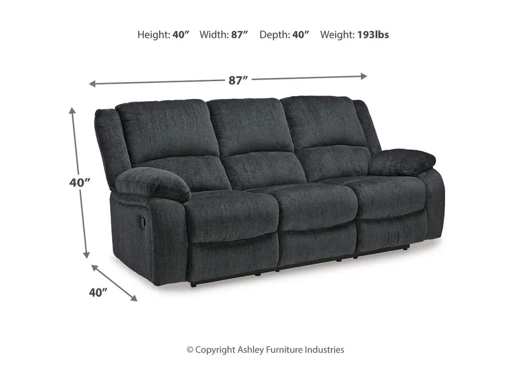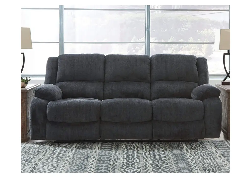 Built for luxury, the Draycoll reclining sofa lets you kick back in reliable style. The thick, softly textured chenille upholstery provides a comfy surface on which to lounge. With bustle back construction and thickly cushioned armrests, this piece gives you the dependable support you need to unwind after a trying day. Weight 210.000 lbs. (94.5kgs.)