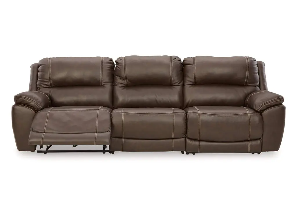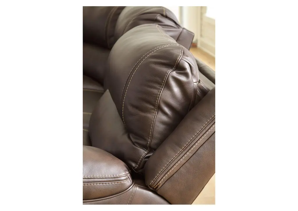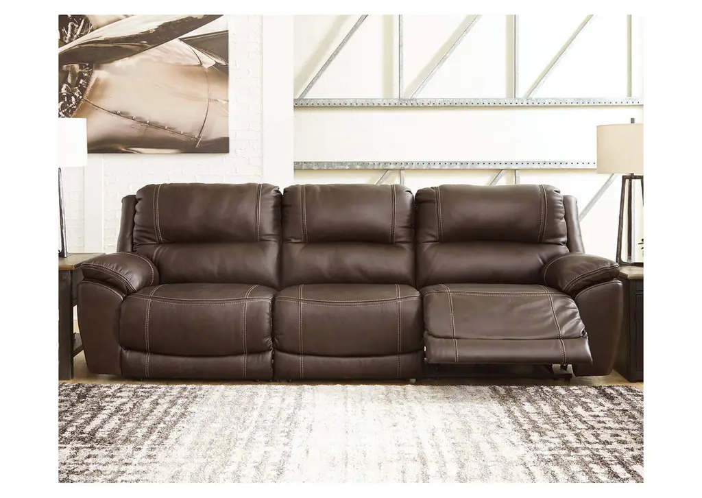 Load up on comfort in a cool, clean-lined and contemporary way with the Dunleith power reclining sofa in chocolate brown. Rest assured, the expertly matched leather and faux leather upholstery is enriched with a pebble grain effect for authentic appeal and enhanced with jumbo stitching for dramatic contrast. It features a one-touch power control with adjustable positions, along with an Easy View™ adjustable headrest that allows a primo view of the TV even when you're reclined. Extended ottomans provide extra length for leg comfort. A zero-draw USB plug-in at your fingertips lets you charge up as you chill out. Weight 314.000 lbs. (141.3kgs.)