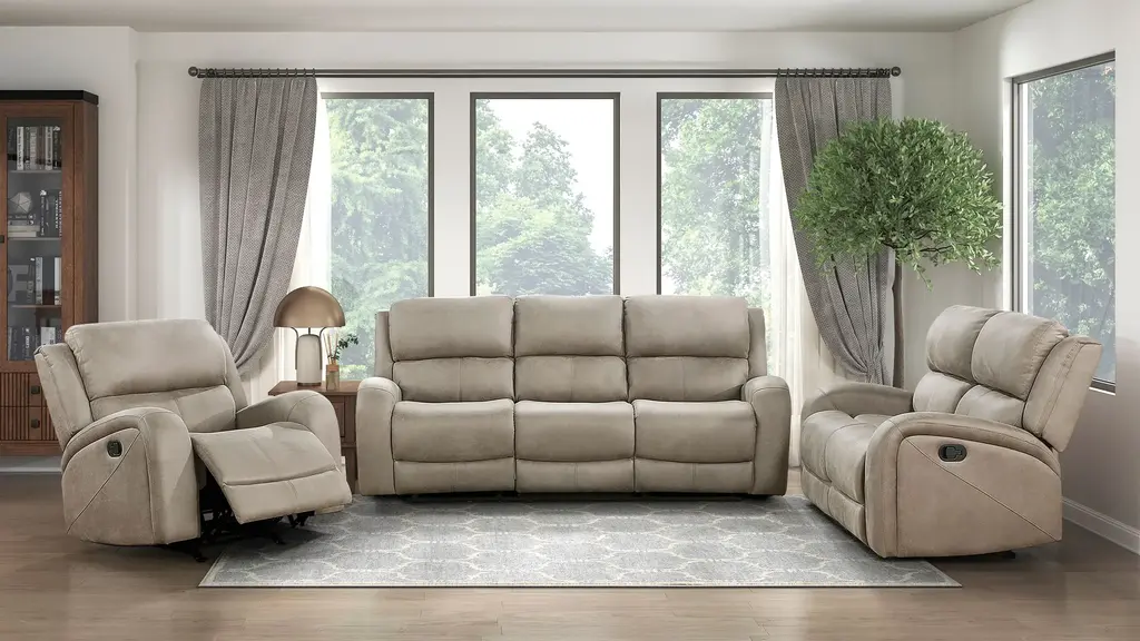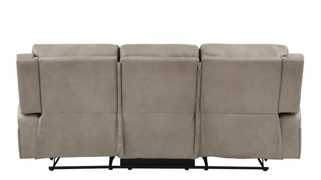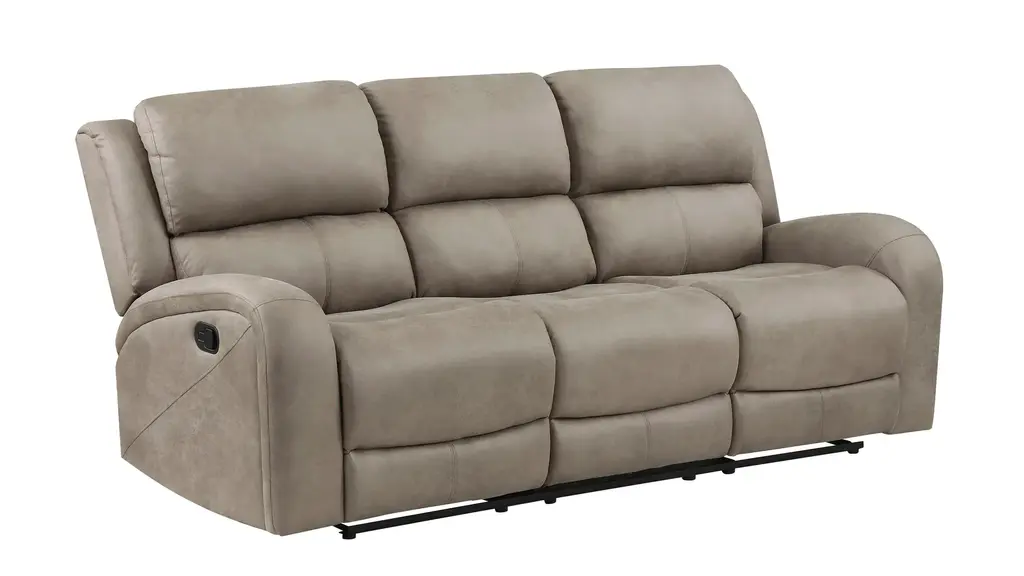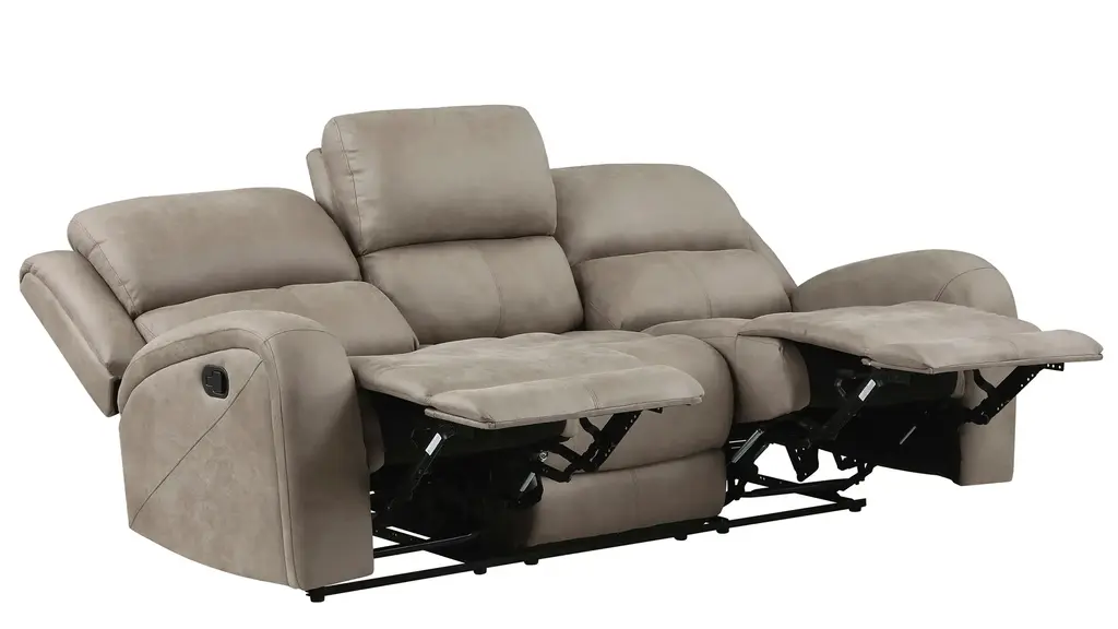 Transitional style is exemplified in the Emillia Double Reclining Sofa, its design pairing plush contoured seating, and versatility of style to create a relaxing space within your home's living room. The plush contoured profile of the collection is covered in polished microfiber. With a pull of the side mounted tabs the dual end reclining mechanisms are engaged easing the sofa into the prone position.