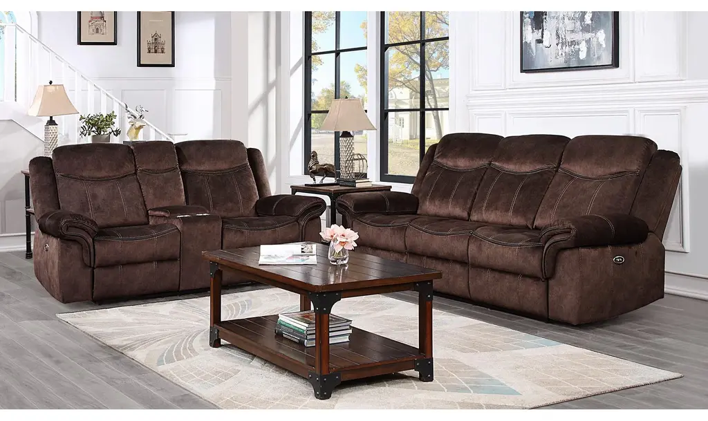 This beautiful motion group's transitional style offers contrasting baseball sticking and leather-like welts along the arm and seat. Crafted from the finest materials, this power recliner sofa features a plush, supportive seat and high backrest, perfect for curling up with a good book or settling in for a movie night with the family. The soft, supple upholstery complements any decor, and the sleek, modern design adds a touch of elegance to your living space. The saddle bag arm adds comfort and style. The console loveseat offers a lift-up storage table and two metal cup holders. Whether you want to unwind after a long hectic day at work or simply want to add a trace of luxury to your favorite place, this power recliner sofa is a perfect choice. So why wait? Treat yourself to the comfort and relaxation you deserve with our premium power recliner sofa today!