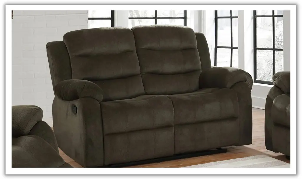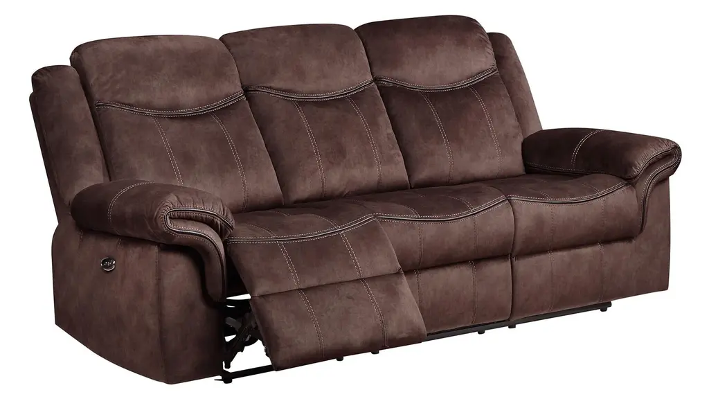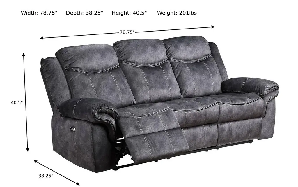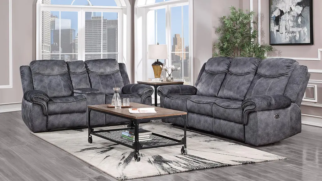 This beautiful motion group's transitional style offers contrasting baseball sticking and leather-like welts along the arm and seat. Crafted from the finest materials, this power recliner sofa features a plush, supportive seat and high backrest, perfect for curling up with a good book or settling in for a movie night with the family. The soft, supple upholstery complements any decor, and the sleek, modern design adds a touch of elegance to your living space. The saddle bag arm adds comfort and style. The console loveseat offers a lift-up storage table and two metal cup holders. Whether you want to unwind after a long hectic day at work or simply want to add a trace of luxury to your favorite place, this power recliner sofa is a perfect choice. So why wait? Treat yourself to the comfort and relaxation you deserve with our premium power recliner sofa today!