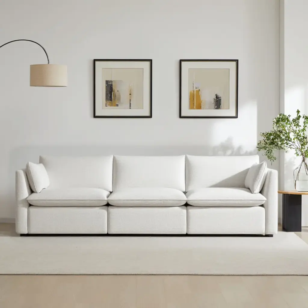 The 3-piece modular sofa offers exceptional comfort with its wide, high-density foam seats and plush, feather-filled cushions. Featuring a smooth reclining mechanism, it's perfect for relaxation or TV watching. The durable, OEKO-TEX certified fabric and FSC-certified wood frame ensure longevity. Easy to assemble without tools, this sofa is designed for modern homes and tight spaces.