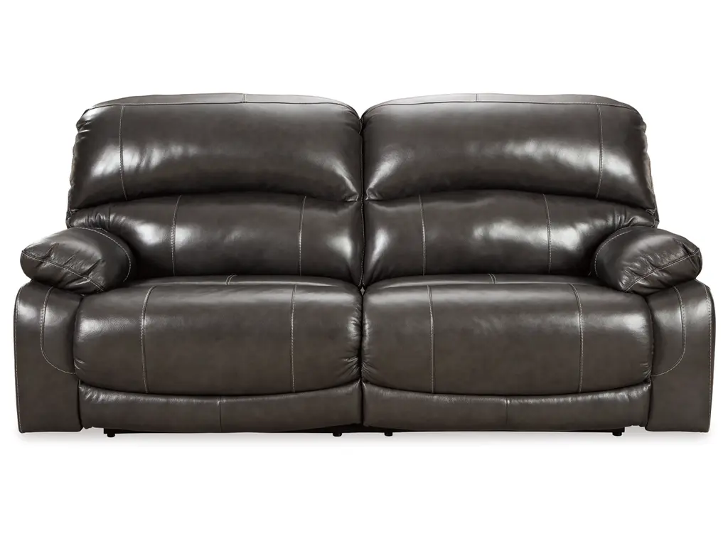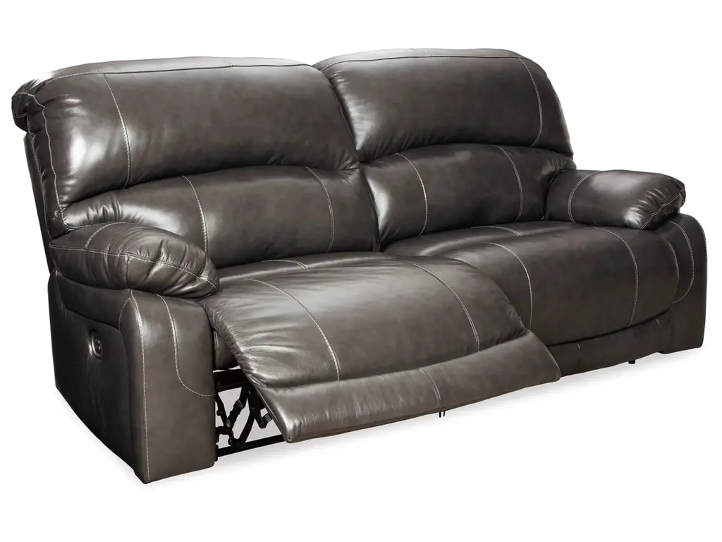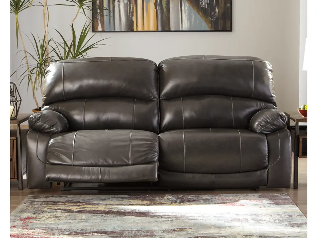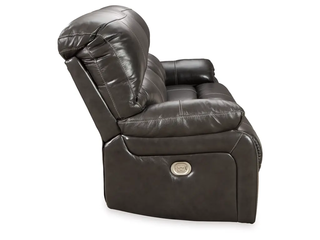 Fashion-forward style. Sumptuous leather feel and appeal. Total comfort at your fingertips. It’s all yours for the taking with the Hallstrung power reclining sofa. Wrapped in a rich charcoal gray upholstery, this decidedly contemporary power sofa tantalizes the senses in so many ways. Rest assured, combination leather and faux leather upholstery makes luxury affordable. Upping the comfort with 44" high back styling, this power sofa truly caters from head to toe. An Easy View™ power adjustable headrest allows you to lean back while propping up your head—perfect for chilling out in front of the TV—while an extended ottoman lets you stretch out all the more. And with a USB port in each power control panel, you hardly have to move a muscle to stay powered up.