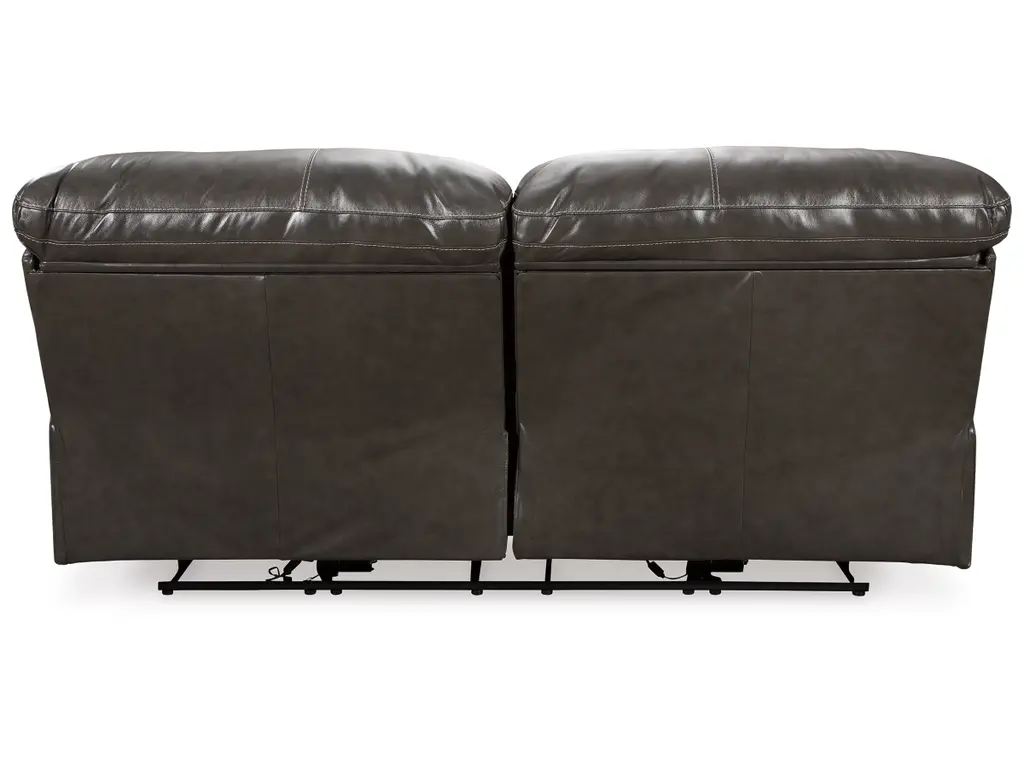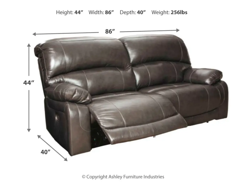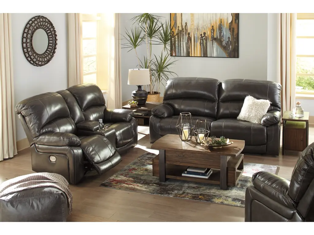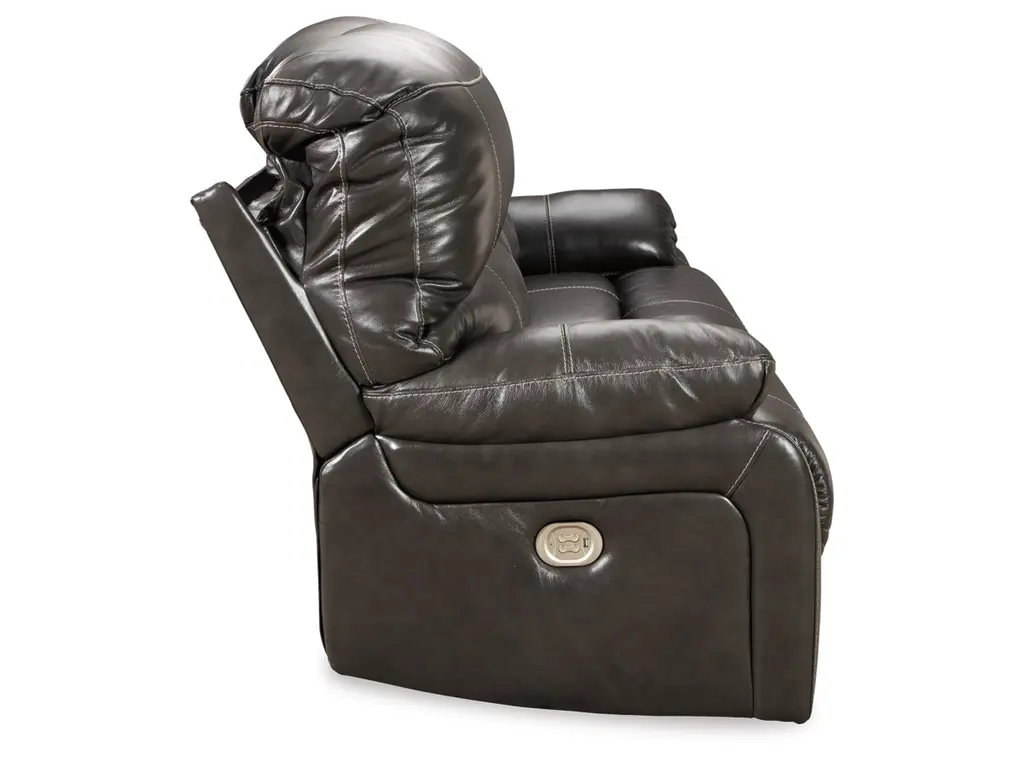 Fashion-forward style. Sumptuous leather feel and appeal. Total comfort at your fingertips. It’s all yours for the taking with the Hallstrung power reclining sofa. Wrapped in a rich charcoal gray upholstery, this decidedly contemporary power sofa tantalizes the senses in so many ways. Rest assured, combination leather and faux leather upholstery makes luxury affordable. Upping the comfort with 44" high back styling, this power sofa truly caters from head to toe. An Easy View™ power adjustable headrest allows you to lean back while propping up your head—perfect for chilling out in front of the TV—while an extended ottoman lets you stretch out all the more. And with a USB port in each power control panel, you hardly have to move a muscle to stay powered up.
