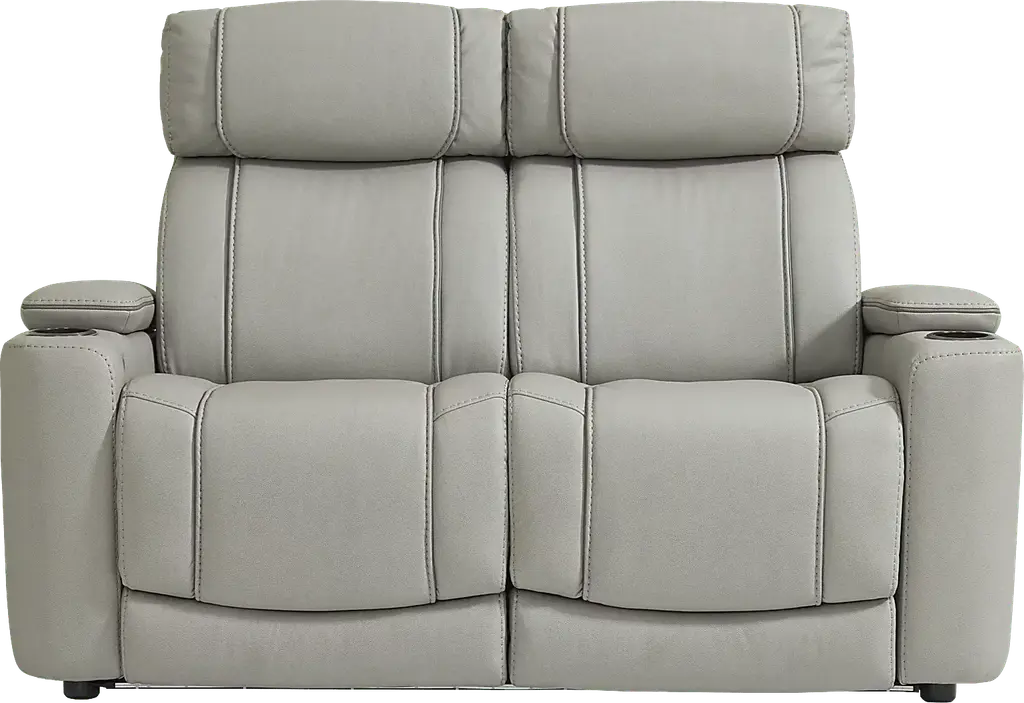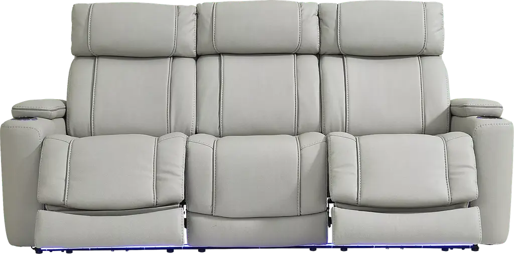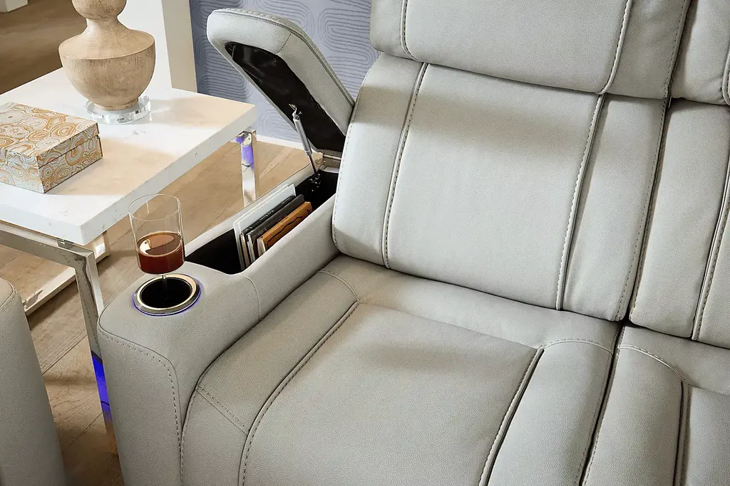 Ease into relaxation mode with the Haven Point collection, your ultimate lounge destination with ultra convenience wrapped in a luxurious look. Requiring just 3.5 inches from a wall to fully recline, this contemporary set features a wall hugging sofa with zero gravity reclining tech and power adjustable head and footrests. The control panels are easy to use and even include USB-A and USB-C charging ports to charge some of your personal devices. The sofa's fold-down cupholder tray enhances your seating experience with wireless charging, reading lights and storage. The sofa's armrests have lighted cupholders and even more storage. The stationary loveseat offers the same inviting feel, providing uninterrupted seating while maintaining the collection's seamless, modern aesthetic. Upholstered with platinum microfiber, the set's look is highlighted by top stitching alongside seams with contrast welting. Ambient blue base rail lighting finishes off the look with a sleek final touch. Upholstery: 85% Polyester, 15% Polyurethane. Cleaning Instructions: Use water based cleaning agents or foam. Tables and lamps not as shown in room image. Accent pillows not included.