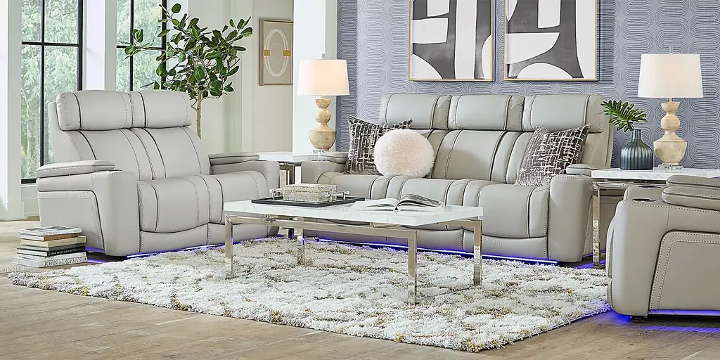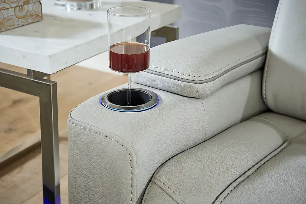 Ease into relaxation mode with the Haven Point collection, your ultimate lounge destination with ultra convenience wrapped in a luxurious look. Requiring just 3.5 inches from a wall to fully recline, this contemporary wall hugging sofa and recliner have zero gravity reclining tech and power adjustable head and footrests. The control panels are easy to use and even include USB-A and USB-C charging ports to charge some of your personal devices. The sofa's fold-down cupholder tray enhances your seating experience with wireless charging, reading lights and storage. The sofa's armrests have lighted cupholders and even more storage. The stationary loveseat offers the same inviting feel, providing uninterrupted seating while maintaining the collection's seamless, modern aesthetic. Upholstered with charcoal microfiber, the set's look is highlighted by top stitching alongside seams with contrast welting. Ambient blue base rail lighting finishes off the look with a sleek final touch. Upholstery: 85% Polyester, 15% Polyurethane. Cleaning Instructions: Use water based cleaning agents or foam. Tables and lamps not as shown in room image. Accent pillows not included.