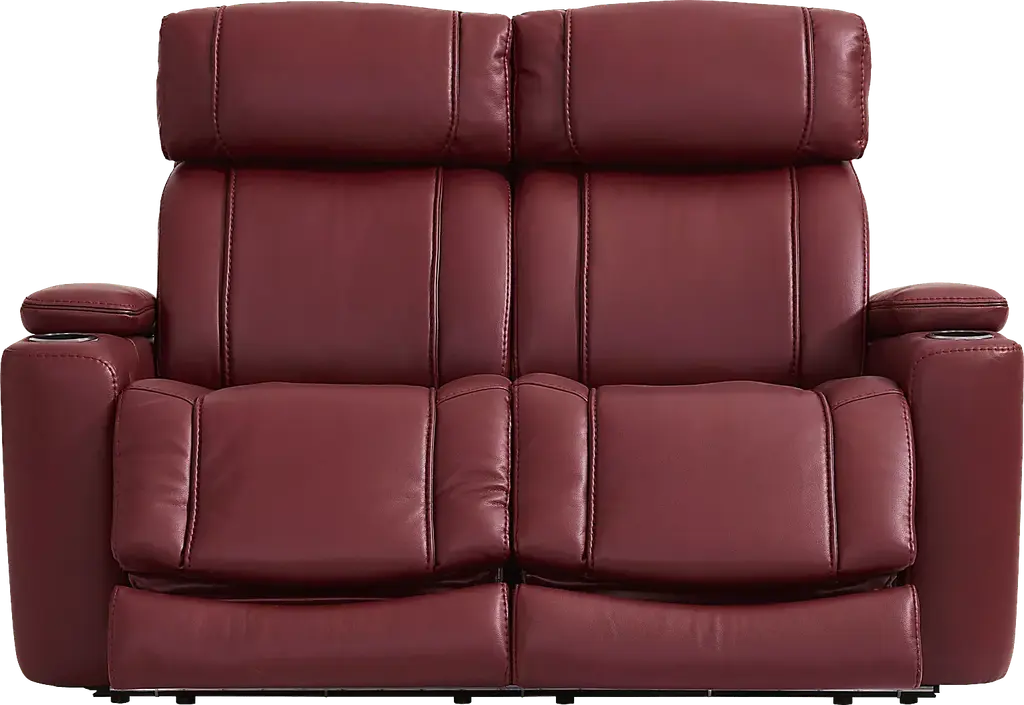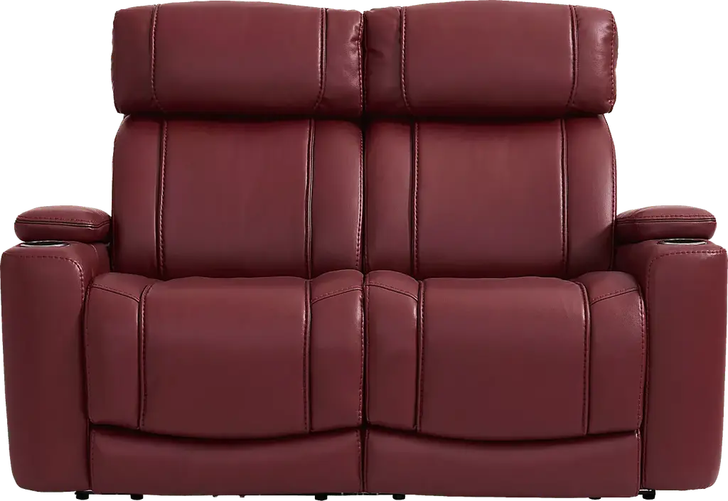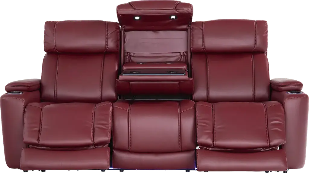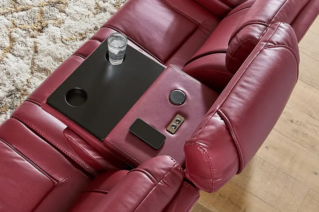 Ease into relaxation mode in a room full of life's finer comforts with the Haven Point collection, your ultimate lounge destination with ultra convenience wrapped in a luxurious look. Requiring just 3.5 inches from a wall to fully recline, this contemporary set of wall huggers features zero gravity reclining tech with power adjustable head and footrests. The panels have easy-to-use controls and even include USB-A and USB-C charging ports to juice up your favorite personal devices. The fold-down cupholder tray enhances your seating experience with wireless charging, reading lights and storage. The sofa's armrests have lighted cupholders and even more storage. The coordinating loveseat reclines with non-power functionality. Upholstered with durable, silky-smooth red microfiber, the sofa, loveseat and matching recliner's look is highlighted by top stitching alongside seams with contrast welting. Ambient blue base rail lighting finishes off the look with a sleek final touch. Upholstery: 85% Polyester 15% Polyurethane. Cleaning Instructions: Use water based cleaning agents or foam. Tables and lamps not as shown in room image. Accent pillows not included.