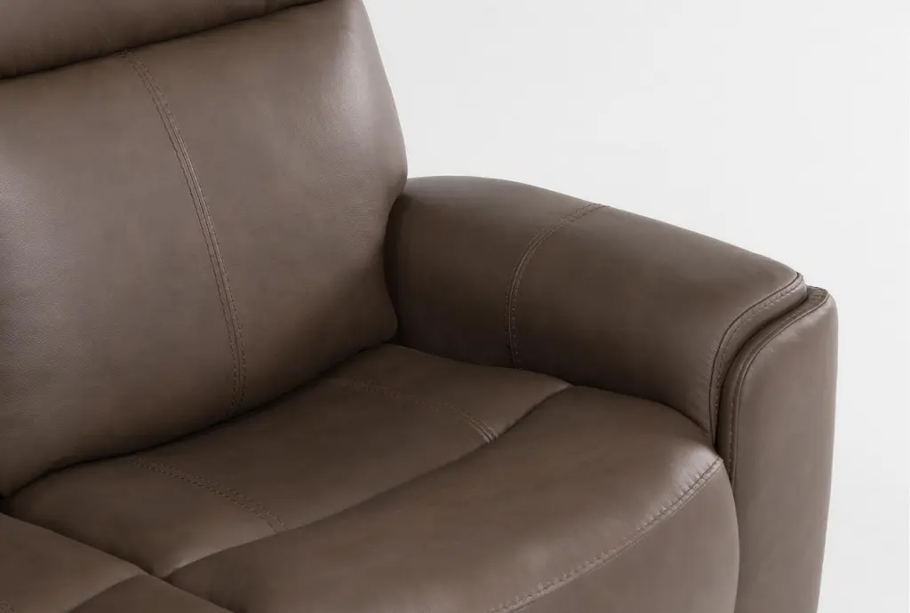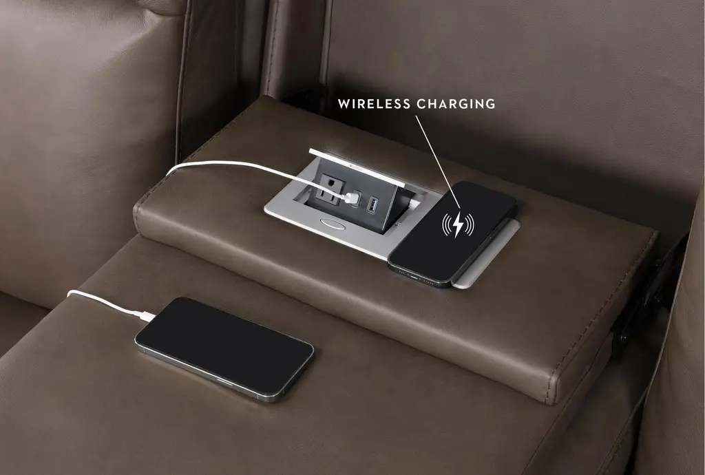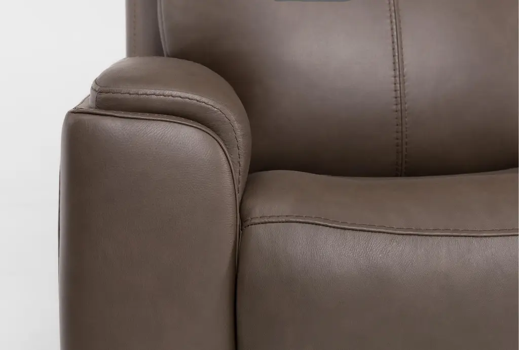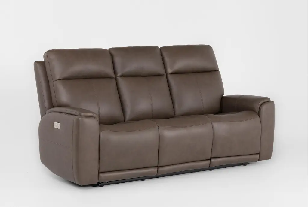Made exclusively for Living Spaces by Flexsteel, our Kinsey leather zero gravity power reclining sofa offers everything you could ever want, from high-quality construction to five-star lounging amenities. Flexsteel's patented Blue Steel Spring™ seat system and top grain leather ensure the utmost in support and luxury. Power reclining, power lumbar and power headrests adjust to multiple positions, including zero gravity, which relieves pressure and improves circulation. Heat and massage features enhance your experience for the ultimate in unwinding. The sofa includes a drop-down table with cupholders and a tech station that boasts power outlets, USB ports and wireless charging.
