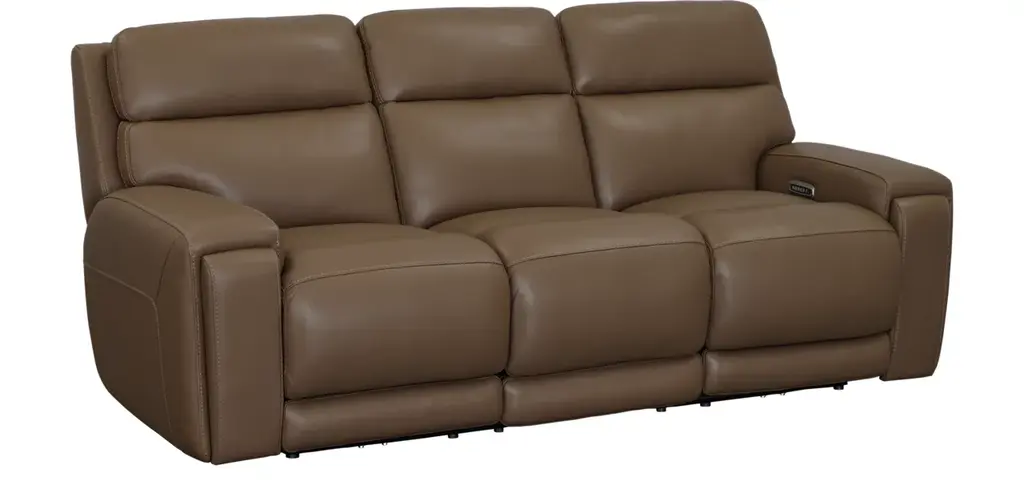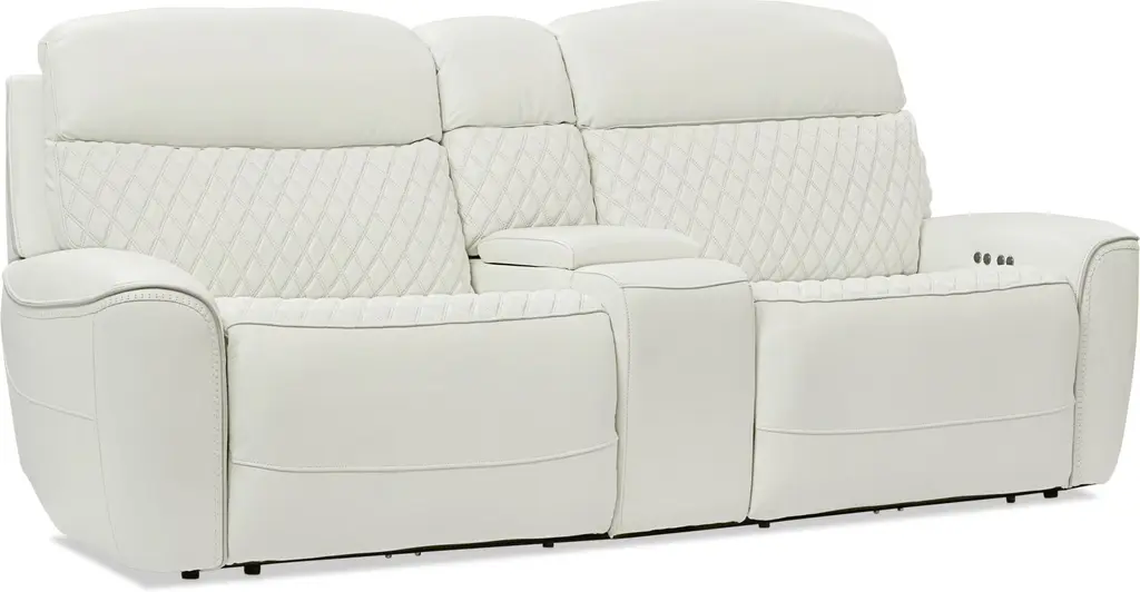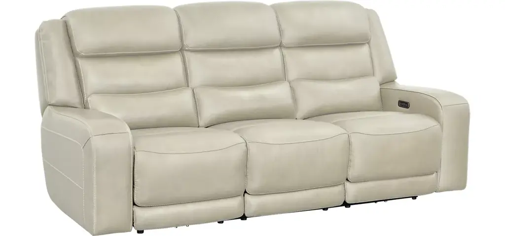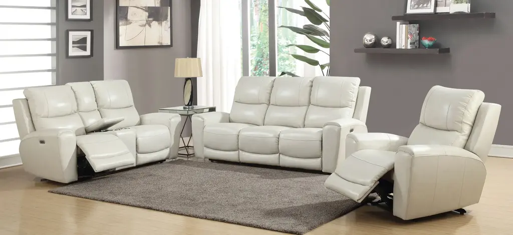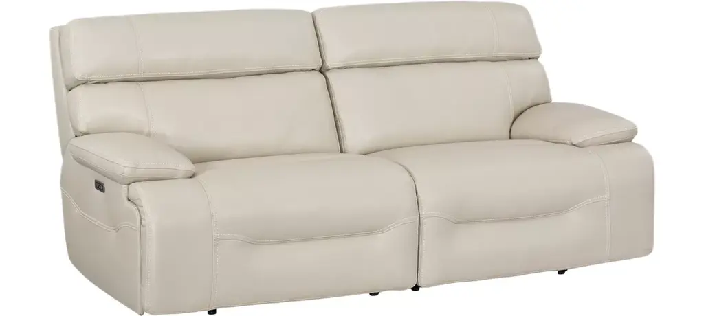 Laurel reclining collection constructed in leather with power leg rest and power articulating headrest. The Laurel Power Reclining Sofa features both styling and convenience with USB charging port on the control panel along with a home button to return the piece to its original position. Double reclining seats for ease of achieving your own level of comfort. Available in Grey or Ivory.