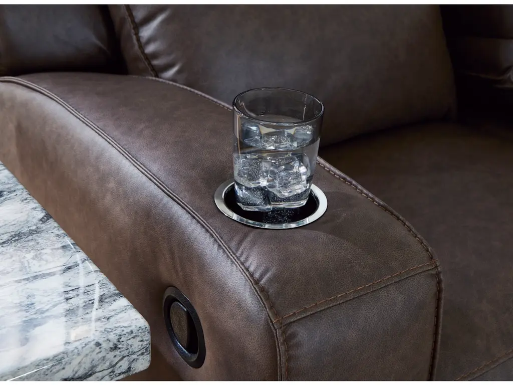 Indulge your lust for comfort and love for contemporary design with the Lavenhorne reclining sofa. Made for easy everyday living, it’s upholstered in a heavyweight padded faux leather and accented with contrast jumbo stitching for fashion-forward flair. Sleek track arms elevate the look with a touch of modern sensibility. A drop-down table with dual cup holders and USB charging completes the experience.