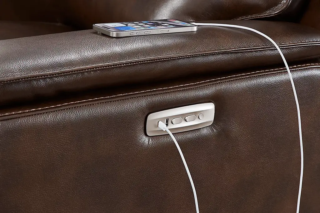 The luxury of a weekend retreat grounded in the familiar calm of home, the Magellan collection's inviting frame blends modern comfort with the refined ease of classic style. Confidently transitional, this sofa is upholstered in chocolate brown top grain leather where the body touches. Deep tufted backs and sumptuously padded track arms deliver cradle-like cushioning, while top-stitched seams accentuate the elegant curves and clean lines that define its handsome silhouette. Dual power reclining features adjustable headrest and footrest for personalized relaxation, along with USB ports on each control panel for added convenience. The sofa's center fold down table reveals hidden cupholders and LED reading lights, creating the ideal setup for a cozy reading session and a relaxing beverage. Dual power LAF reclining loveseat, dual power RAF recliner. Upholstery: Top grain leather where the body touches and vinyl sides and backs. Accent pillows not included.