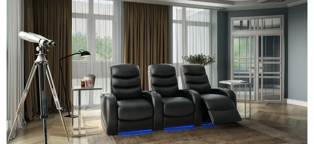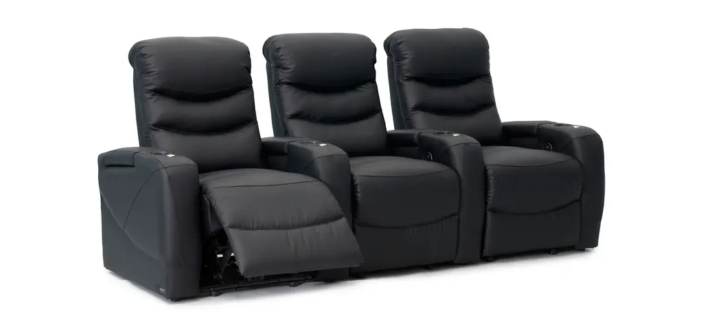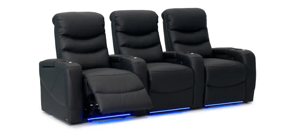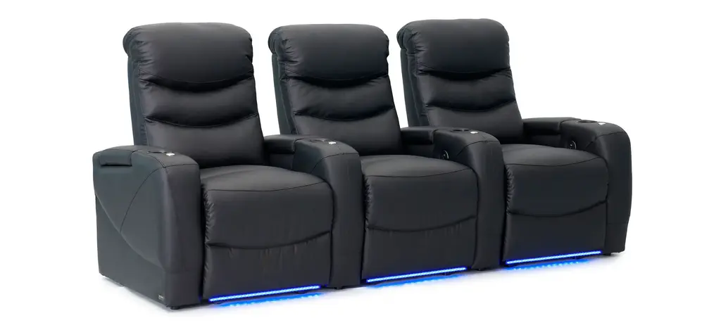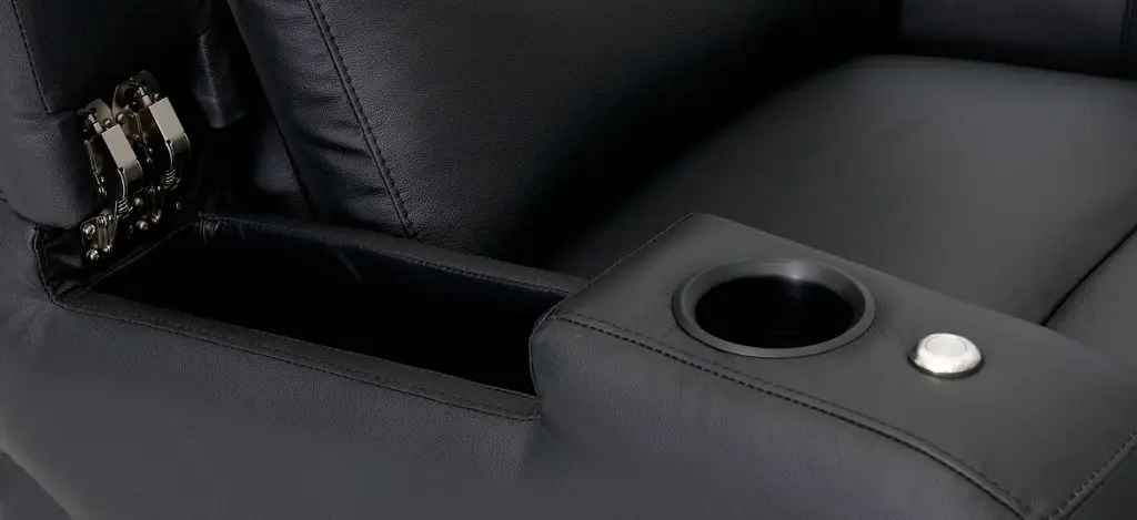 The Majestic 3-pc. leather power-reclining sectional sofa with lighting is luxury home theater seating that features a new level of comfort and design that brings to the forefront the full range of features and benefits available in furniture today. Storage, lights, accessories and supreme comfort all found together in this piece of furniture from the powerhouse design team at Bellanest. The Majestic delivers on the promise of extreme comfort through its densely padded triple split seat back that resides on top of a seat cushion that contains pocket coils for long-lasting comfort. The footrest is chaise styled - our preferred - to offer full leg support during those long hours while you enjoy the show. The gently sloping arms include hidden storage for your remotes and books and black metal cup holders. The entire seating surface is covered in a premium black top grain leather that is soft and gets even better with everyday use and age. The inside arm includes a power switch which will recline the chair to the perfect angle for the show. The switch itself also has a USB charging port for your tablets and mobile phones. Are you ready to take your entertainment to the next level?