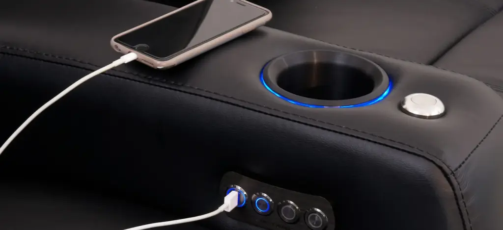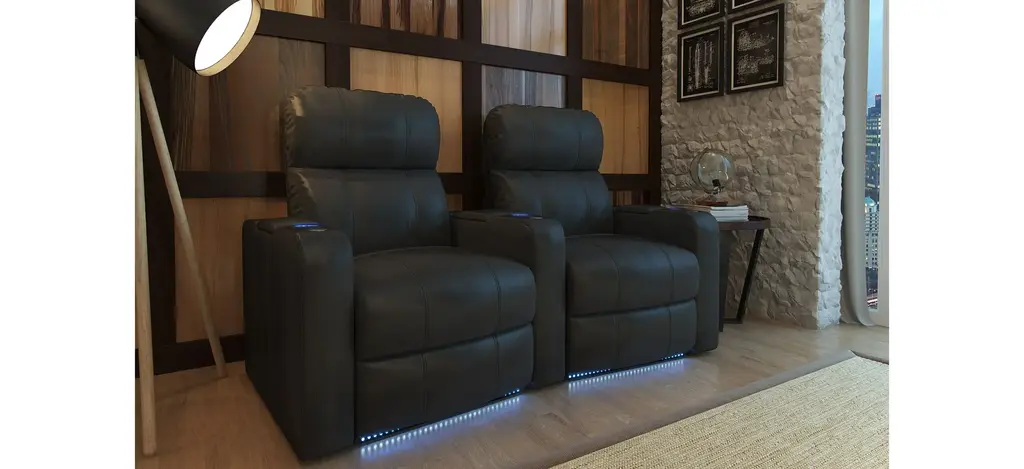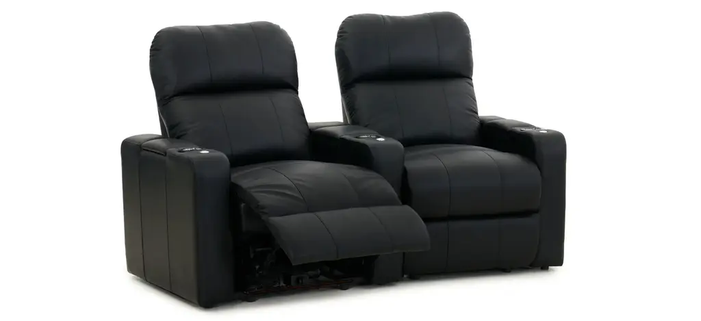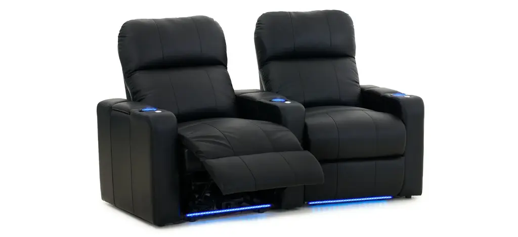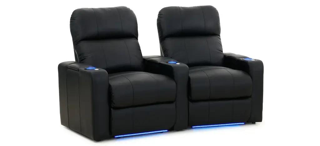 The Marquee 2-pc. leather power-reclining loveseat is a great addition to your home theater. This sofa is a row of 2 curved seats in black leather and it power-reclines. This piece offers a premium layer of gel-infused foam in the seat cushion for unparalleled comfort. This also sofa features storage compartments in each arm, blue LED light up cup holders and base, a chaise styled foot rest and push-button recline.