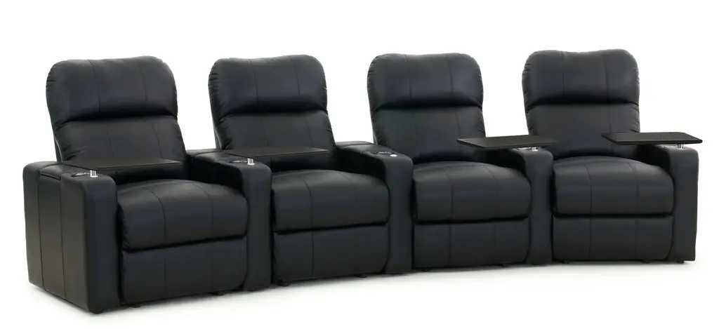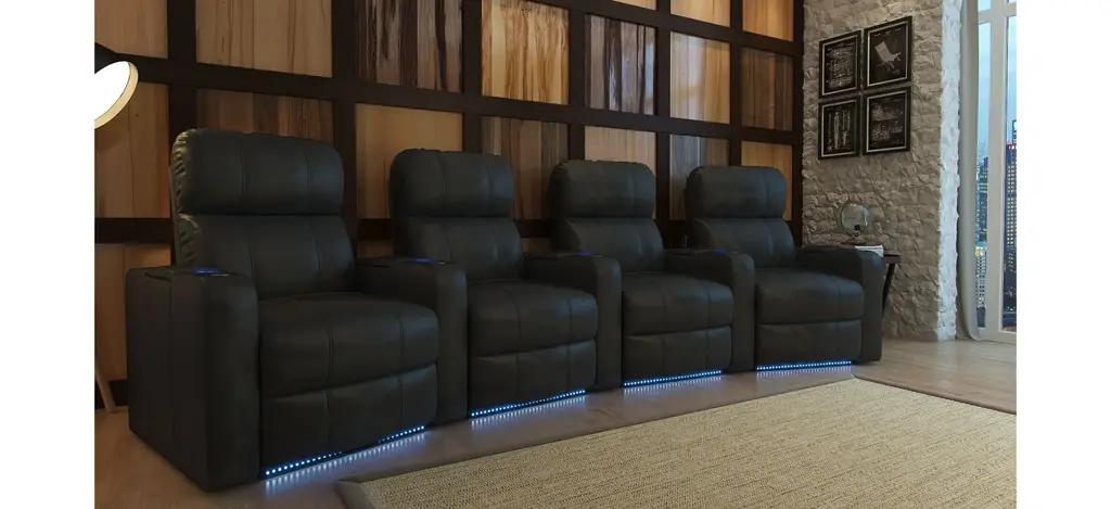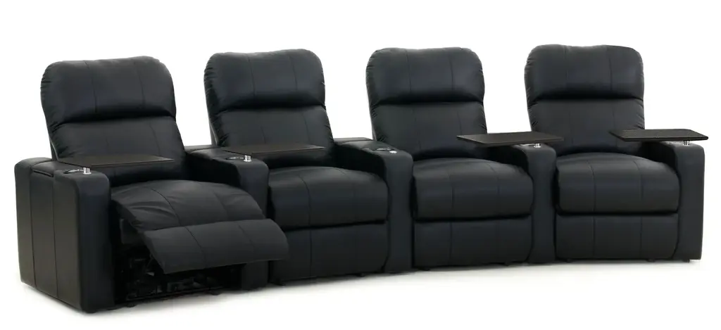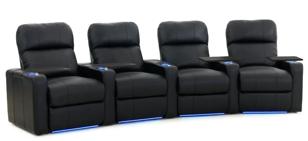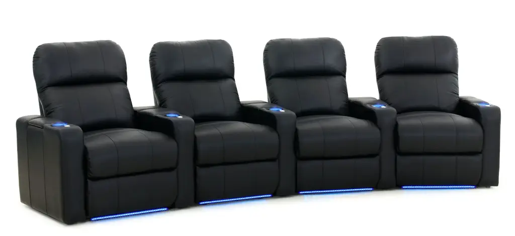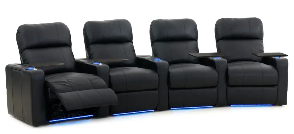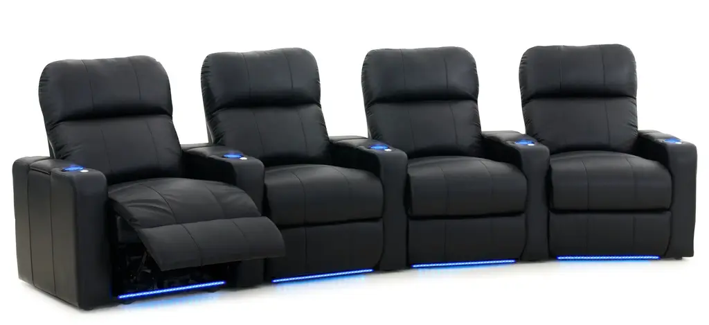 The Marquee 4-pc. leather power-reclining sectional sofa is a great addition to your home theater. This sofa is a row of 4 curved seats in black leather and it power-reclines. This piece offers a premium layer of gel-infused foam in the seat cushion for unparalleled comfort. This sofa also features storage compartments in each arm, blue LED light up cup holders and base, a chaise styled foot rest and push-button recline.