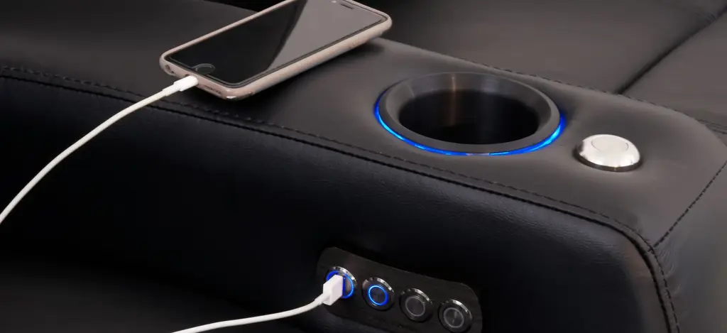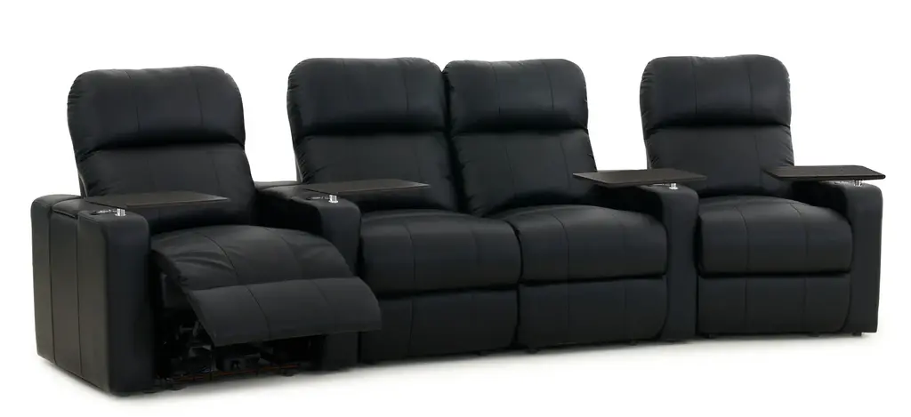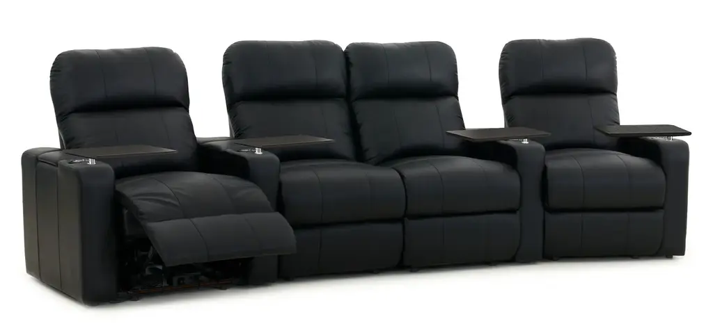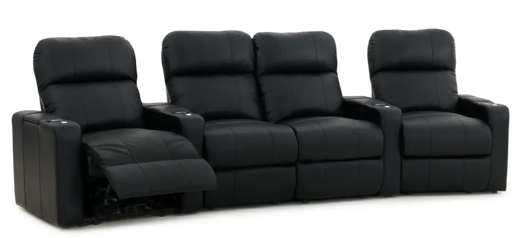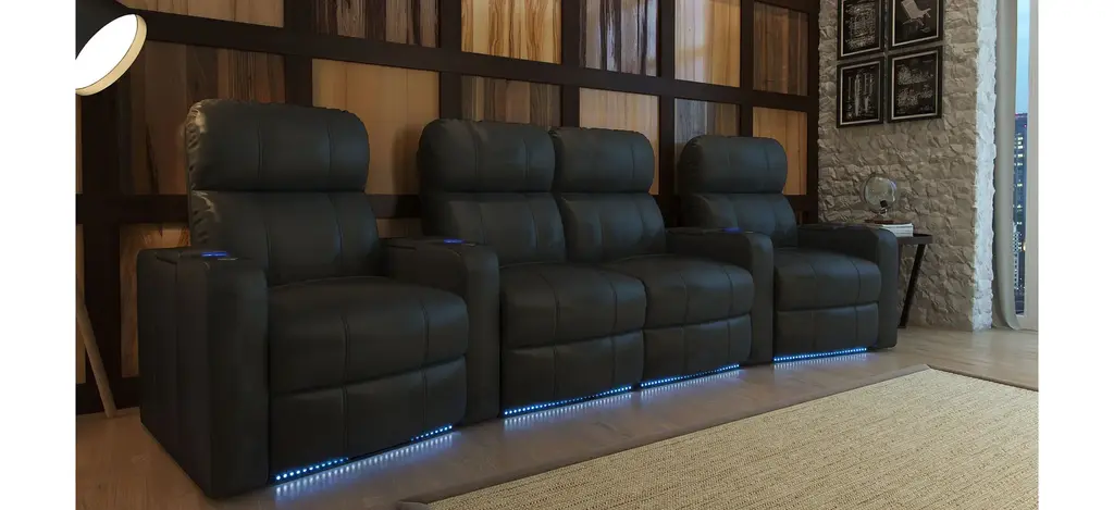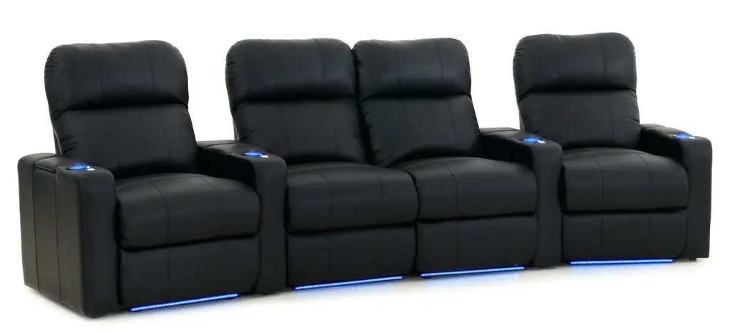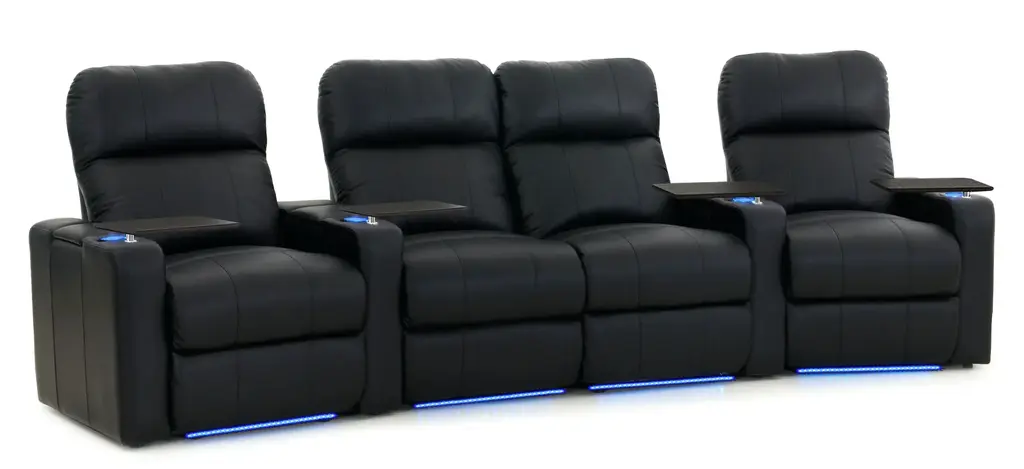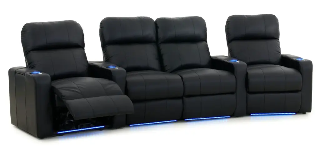 The Marquee 4-pc. leather power-reclining sectional sofa is a great addition to your home theater. This sofa is a row of 4 curved seats in black leather and it power-reclines. This piece offers a premium layer of gel-infused foam in the seat cushion for unparalleled comfort. This sofa also features storage compartments in each arm, blue LED light up cup holders and base, a chaise styled foot rest and push-button recline.