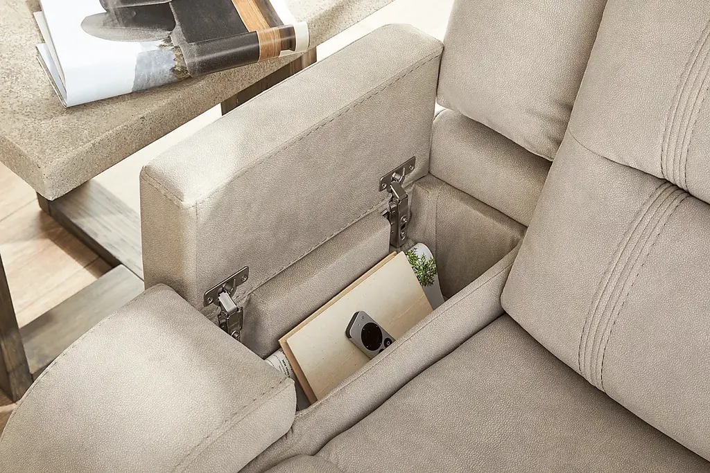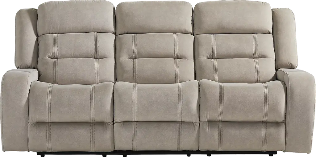 A calming hush settles, the room begins to feel less like a place and more like a quiet, comfortable pause as the McKinley collection's soft textures and clever luxury invite effortless relaxation. This classically styled sofa is wrapped in soft beige microfiber and showcases generously deep tufting for a cloudlike silhouette. Contrasting top-stitched seams add tailored definition throughout, while the seats and back feature highly decorative double stitching for a refined touch. Hidden cupholders tucked into the arms offer a sleek solution for keeping drinks within reach, while the center fold-down table includes extra cupholders and a storage pocket. For a delightful final touch, recline effortlessly with the pull of a handle. Upholstery: 100% polyester.