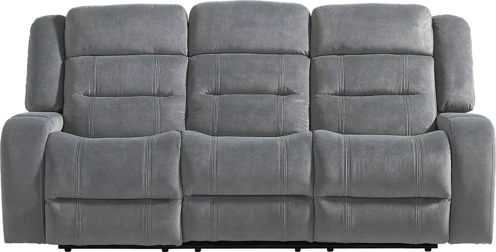 A calming hush settles, the room begins to feel less like a place and more like a quiet, comfortable pause as the McKinley collection's soft textures and clever luxury invite effortless relaxation. This classically styled sofa is wrapped in soft graphite gray microfiber and showcases generously deep tufting for a cloudlike silhouette. Contrasting top-stitched seams add tailored definition throughout, while the seats and back feature highly decorative double stitching for a refined touch. Hidden cupholders tucked into the arms offer a sleek solution for keeping drinks within reach, while the center fold-down table includes extra cupholders and a storage pocket. For a delightful final touch, recline effortlessly with the pull of a handle. Upholstery: 100% polyester.