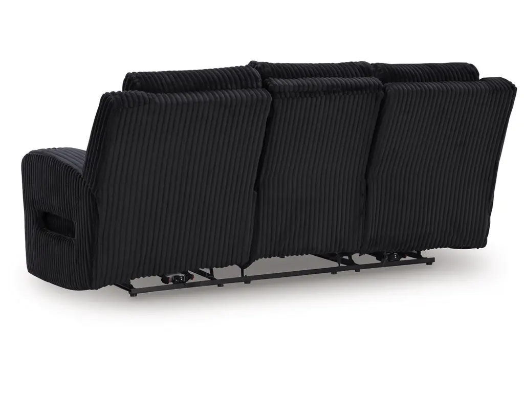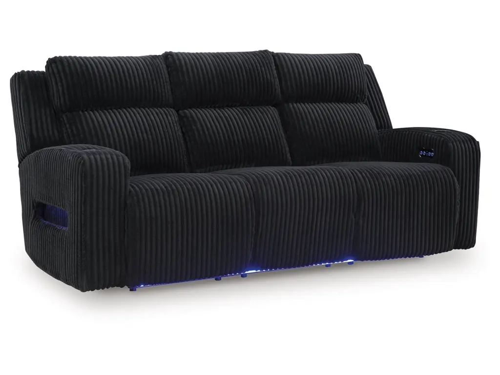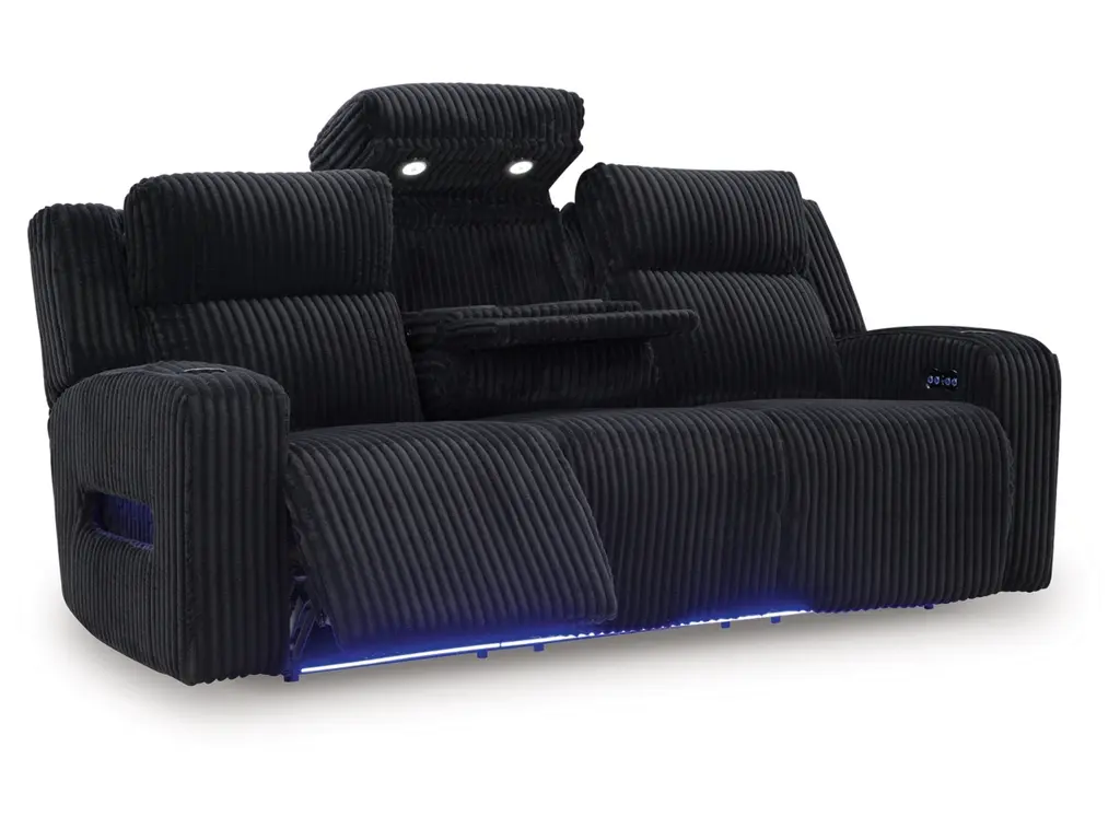 Trend-right style, meet irresistible modern function. Your living room gets a cozy-cool upgrade with the TwinBrooke power reclining sofa. Curl up in its ultra-chic corded upholstery and recline with one-touch controls. Is it movie night or game time? With ambient LED lighting and wireless audio connectivity, this sofa transforms from a serene relaxation spot to an entertainment hub. Its drop-down table, USB charging and cup holders make lounging all the more convenient.