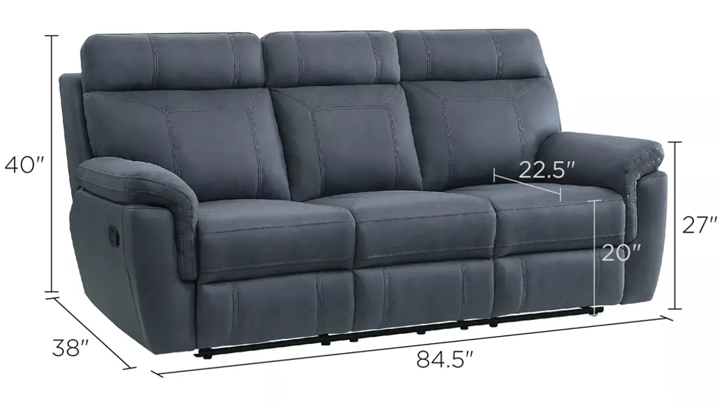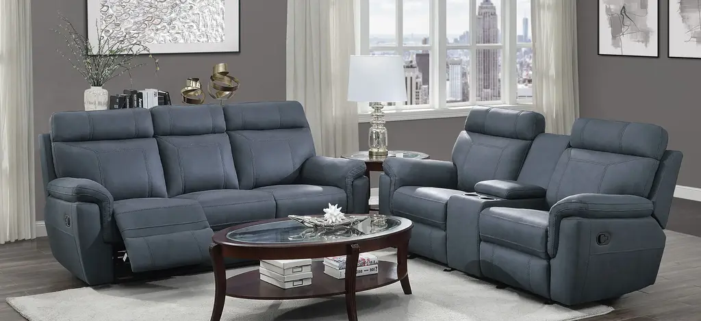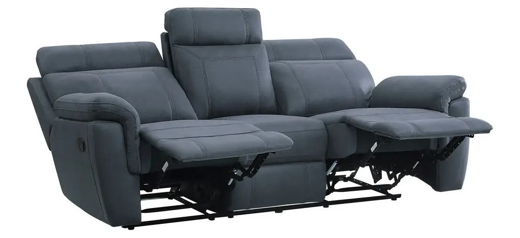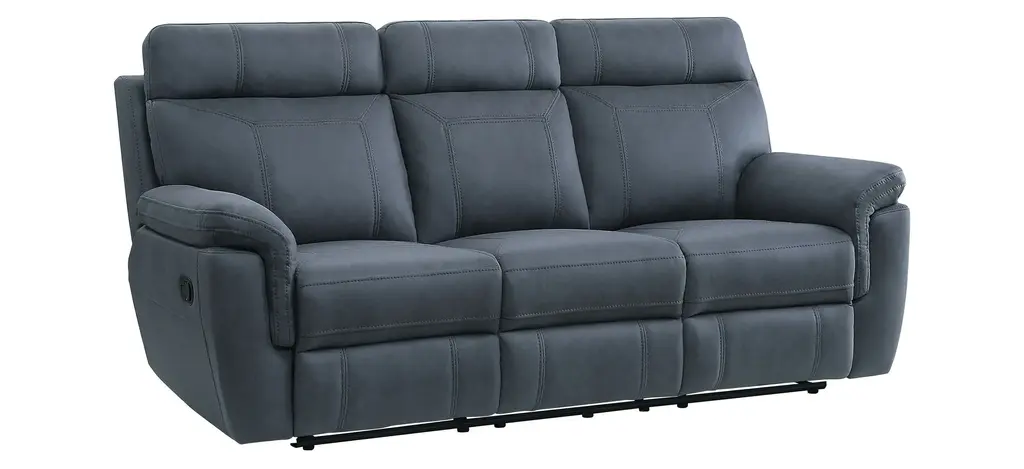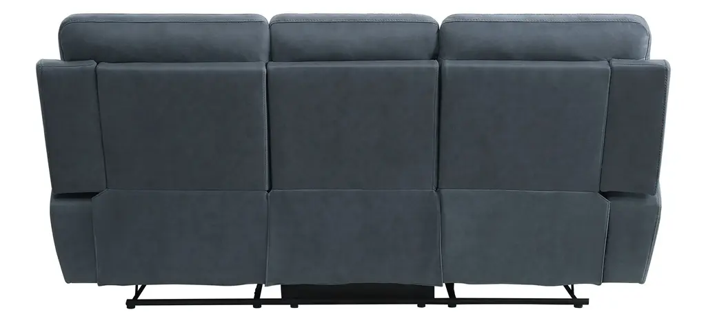 The modern profile of the Walter Collection serves to provide comfort, function and style to your home's casual living room. The blue polished microfiber that covers the plush arms and seating of the sofa lends to the decorative versatility of the collection. The sofa features dual reclining ends as well as a drop-down center seat back with cup-holders and tabletop. Manual motion mechanisms operate with the pull of a side-mounted tab, that once engaged, take you from seated to reclined in an easy motion.