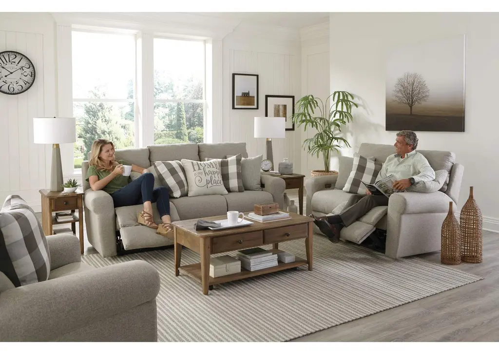 WESTPORT features a Farmhouse Casual style with its Greek Key arm treatment, sofy body fabric, and Home is my Happy Place mood pillow standard. Power Recline upgrade available on all pieces. Weight 240.000 lbs. (108kgs.)